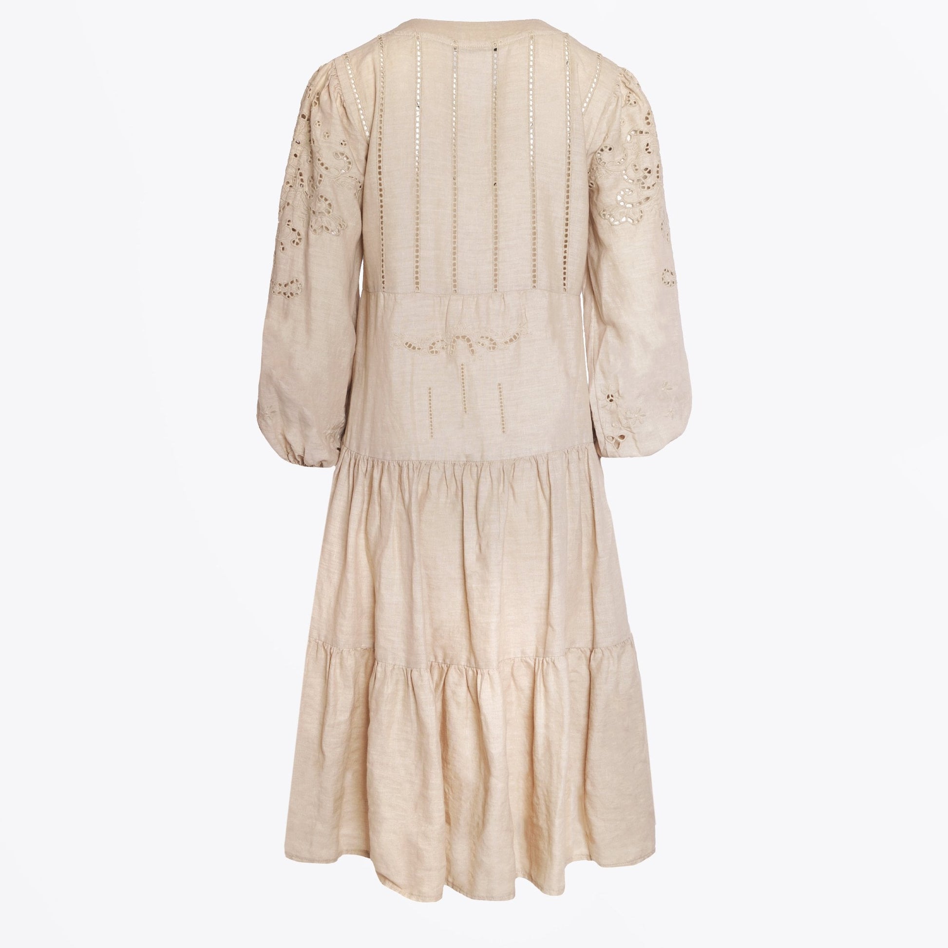 The Greek Archaic Kori Collection 2022 is a lifestyle brand that highlights resort wear and pays homage to the sun sea and island lifestyle amongst the Greek isles. Made in Greece, this new collection is light, bright and with a touch of quirkiness that is sure to brighten up your new season wardrobe.�� Perfect for your next holiday destination, this dress is crafted in a beige material with a broidery design. This dress features a multi-tier design with bell sleeves and a tied v-neckline. Perfect for your next holiday destination, wear with some heeled espadrilles for a cute dinner date outfit.