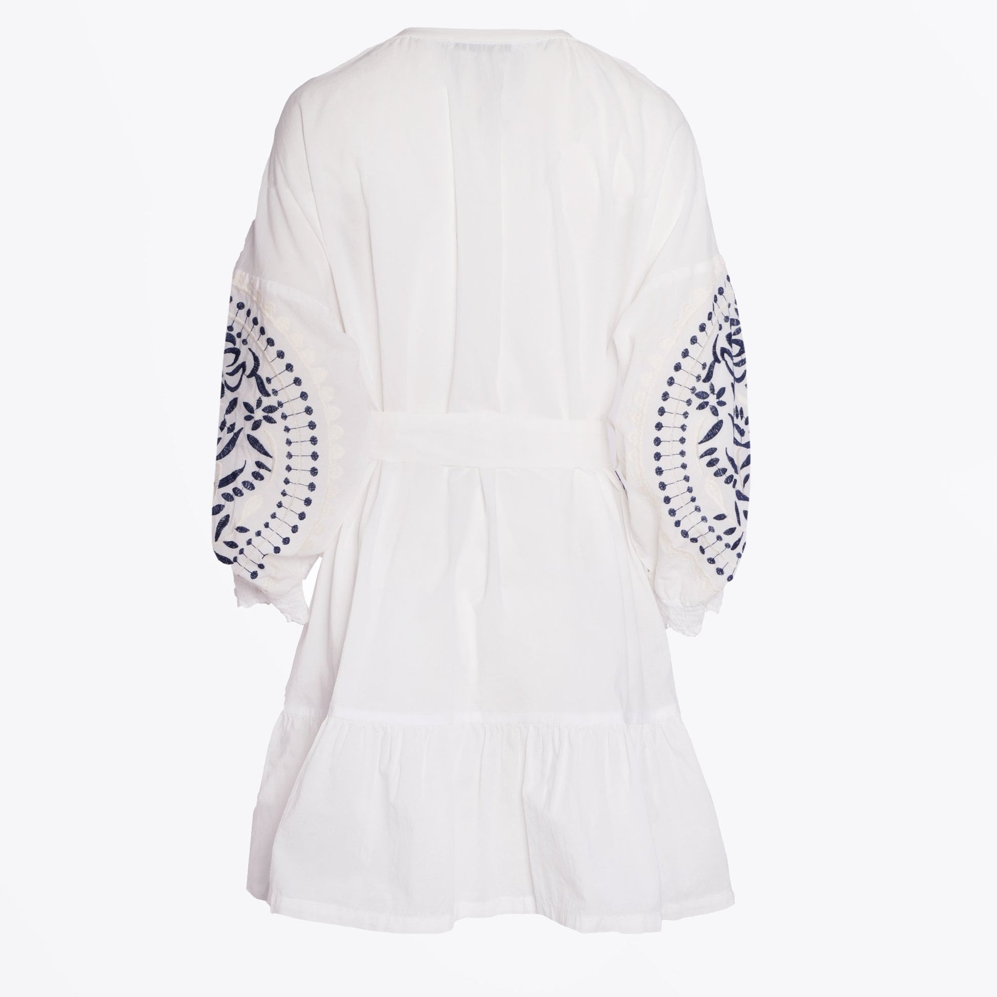 The Greek Archaic Kori Collection is a lifestyle brand that highlights resort wear and pays homage to the sun sea and island lifestyle amongst the Greek isles. Made in Greece, this new collection is light, bright and with a touch of quirkiness that is sure to brighten up your new season wardrobe.�� Perfect for your next holiday destination, this mini dress is crafted in white and features a paisley design both navy and off-white thread. This dress also features statement bell sleeves with a v-neckline. The silhouette for this dress makes it fitting for any occasion, as its wider fit can help it to be styled casually, but this dress also looks flattering with heeled espadrilles. Wear this dress on holiday with your favourite pair of designer trainers, available at Mr & Mrs Stitch.