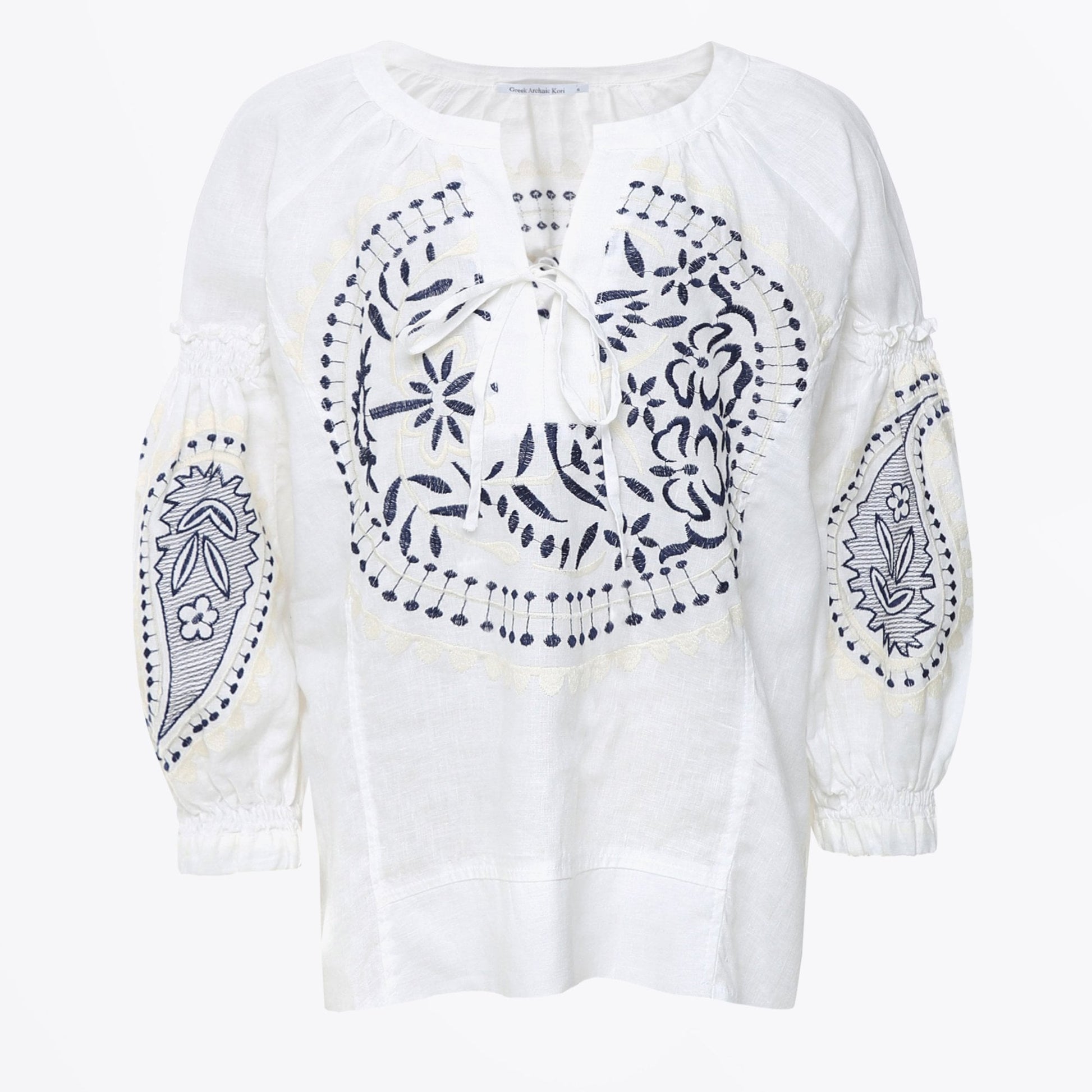 The Greek Archaic Kori Collection 2022 is a lifestyle brand that highlights resort wear and pays homage to the sun sea and island lifestyle amongst the Greek isles. Made in Greece, this new collection is light, bright and with a touch of quirkiness that is sure to brighten up your new season wardrobe.�� Perfect for your next holiday destination, this bell sleeved top is crafted in white and features a paisley medallion embroidery in both navy and off-white thread. The silhouette for this top is great for a casual outfit on your next holiday; wear this top with a pair of denim shorts and some heeled espadrilles, for a more refined look.