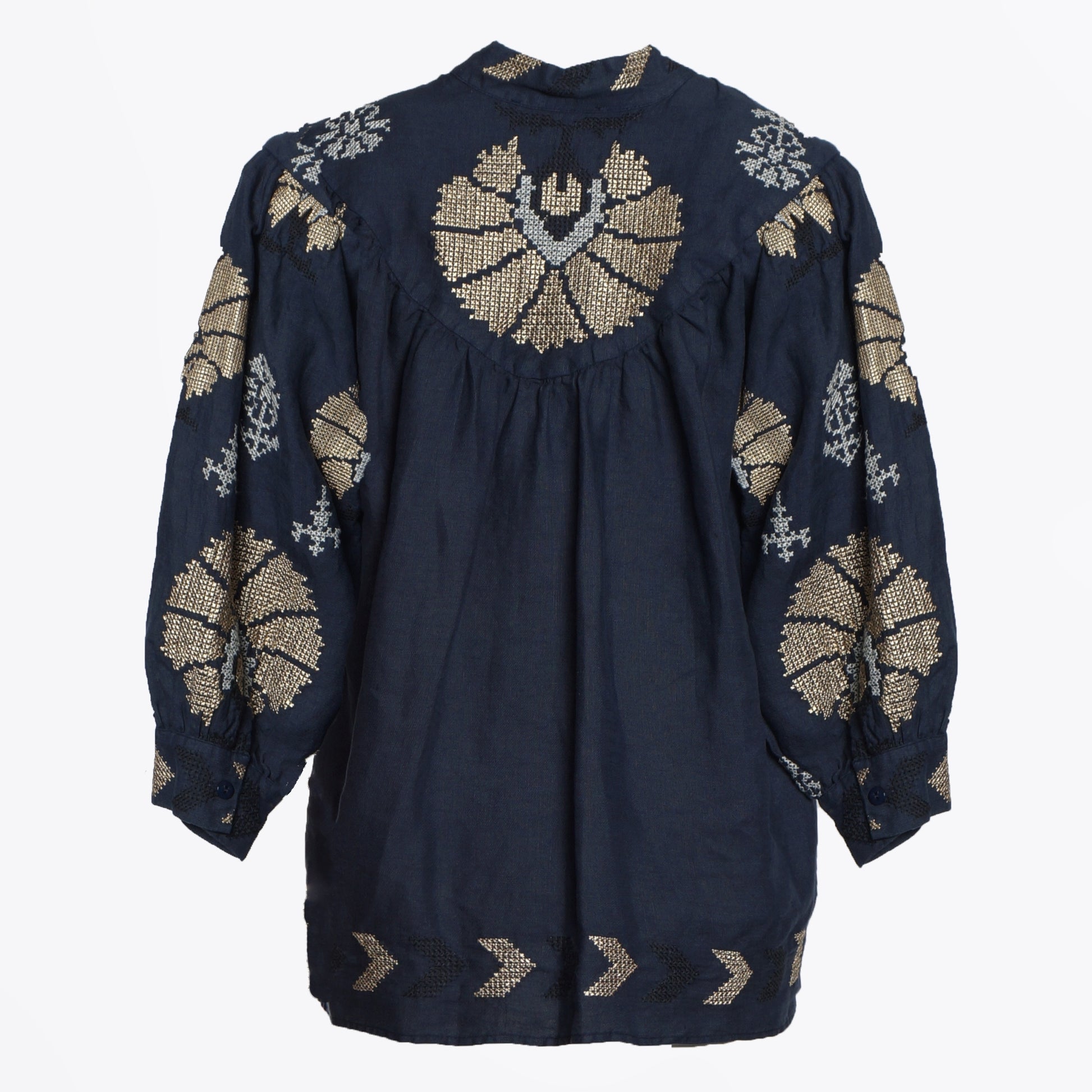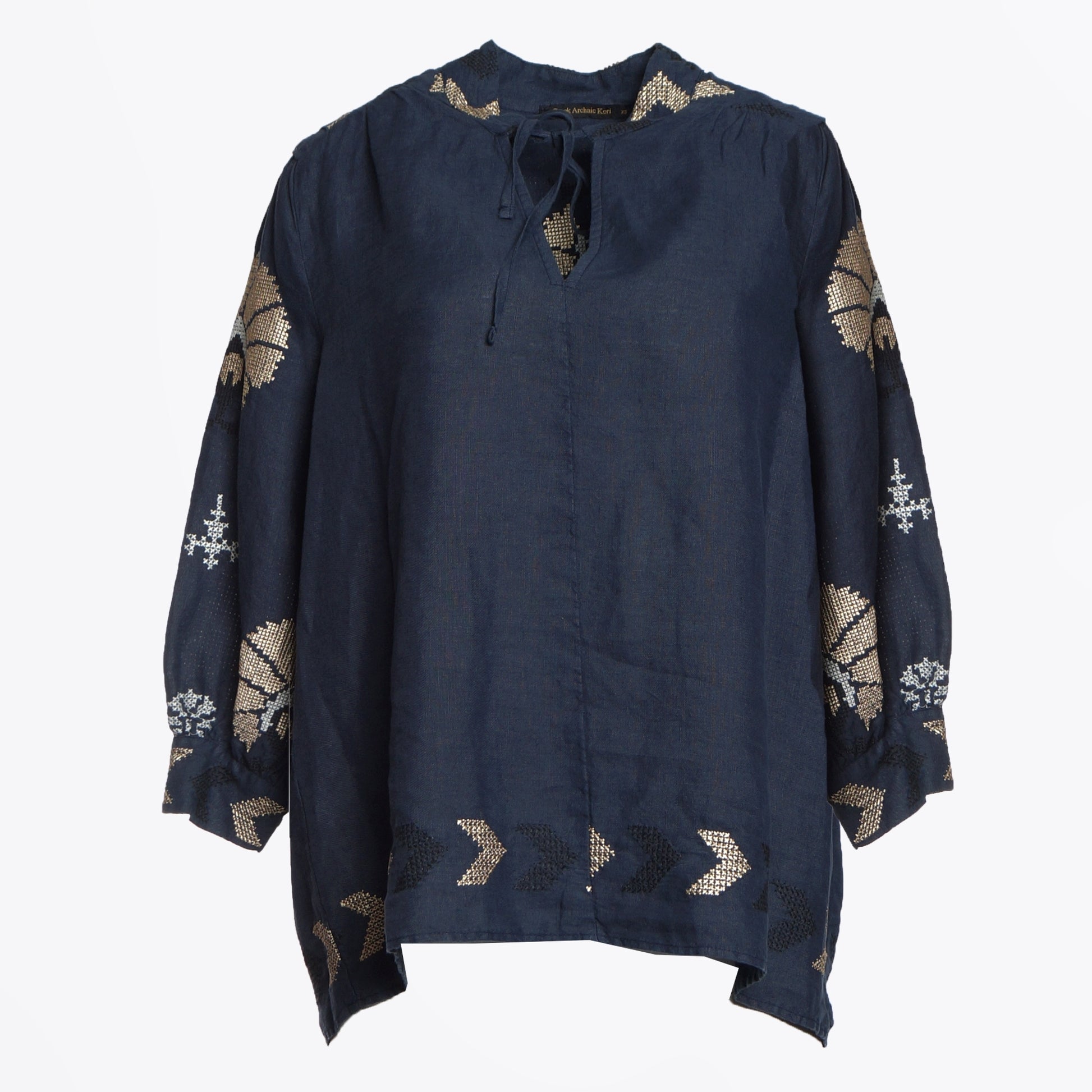 The Greek Archaic Kori Collection 2024 is a lifestyle brand that highlights resort wear, and its style signifies the sun, the light, the sea and the islands. Made in Greece. Colourful yet simple and minimal, crafted from relaxed cotton and linen fabrics that delicately float with the breeze. Contrast stitching and embroidery are just a few of the charming elements that you will appreciate in this collection. This mini top is the perfect companion on your next sunny destination and features a golden peacock embroidered pattern throughout, with long sleeves, buttoned cuffs, drawstring collar and a v-neckline. Style this with a pair of Castenar espadrilles for the perfect summer look.