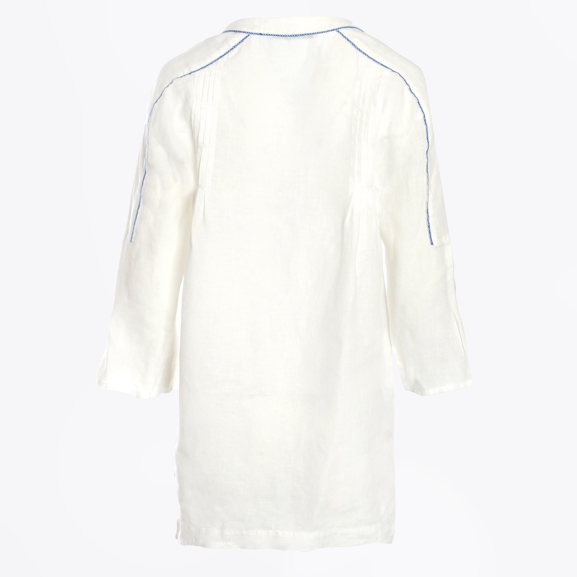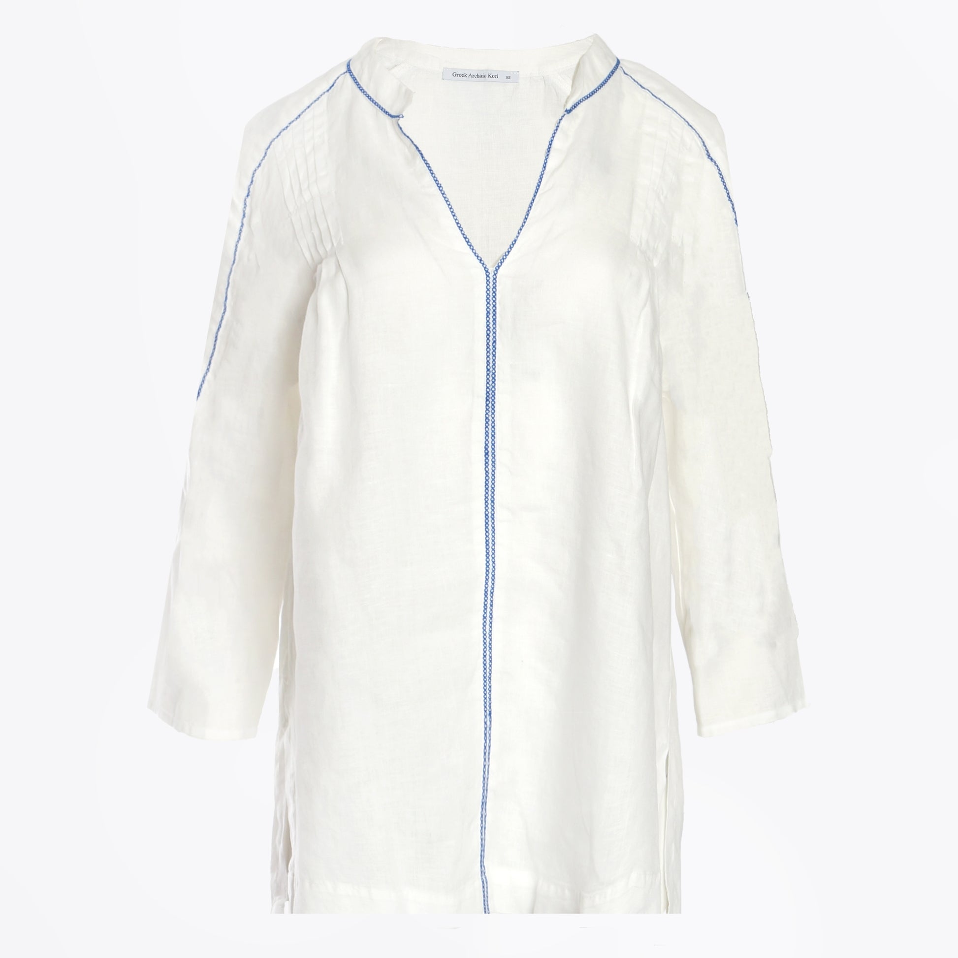 The Greek Archaic Kori Collection 2023 is a lifestyle brand that highlights resort wear and its style signifies the sun, the light, the sea and the islands. Made in Greece. Colourful yet simple and minimal, crafted from relaxed cotton and linen fabrics that delicately float with the breeze. Contrast stitching and embroidery are just a few of the charming elements that you will appreciate in this collection. This V-neck top is the perfect companion on your next sunny destination and features a bold blue cross stitch embroidery around the neckline shoulders and chest. This top has 3/4 length sleeves, pleated details on the shoulders, and splits at the side seams. Style this top with a pair of shorts and some strappy sandals for the perfect summer look.