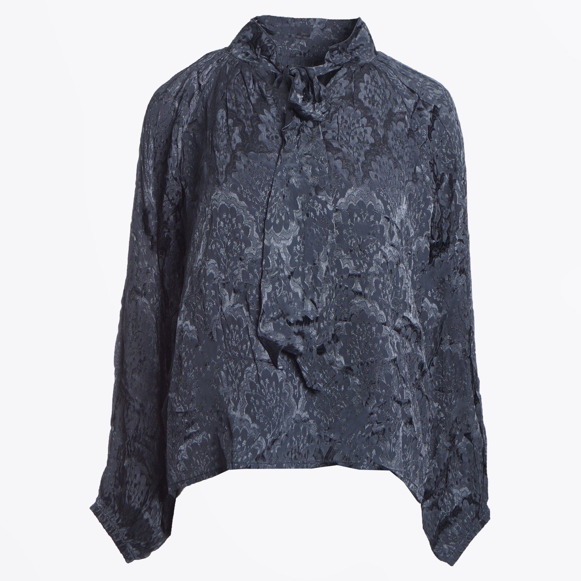 The new Dream collection reflects summer days and nights of an easy island life. Colourful yet simple and minimal, crafted from light weight cotton fabrics that delicately float with the breeze. The perfect way to add colour to your winter collection, this navy jacquard blouse features a floral design throughout, rounded neckline with a necktie and elasticated cuffs. Wear blouse with some Paul Smith trousers and Mexicana boots.