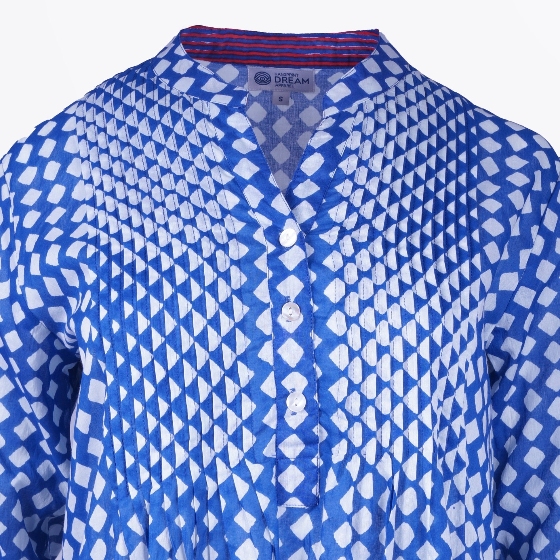 The new DREAM SS Collection reflects summer days and nights of an easy island life. Colourful yet simple and minimal, crafted from light weight cotton fabrics that delicately float with the breeze. Perfect to wear by the beach for a little pop pf colour, this midi dress features a blue and white diamond print with a buttoned placket, pintuck pleats at the chest and long sleeves. This dress also has pockets! Wear this dress over your swimsuit as a way to add some designer luxury on your next beach day, with a pair of Veja trainers, available at Mr & Mrs Stitch.