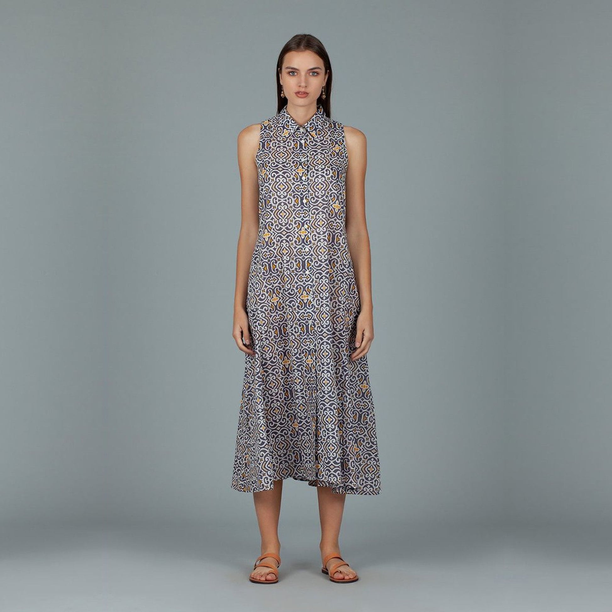 The new DREAM SS Collection 2020 reflects summer days and nights of an easy island life. Colourful yet simple and minimal, crafted from light weight seer cotton fabrics that delicately float with the breeze. Hand printed motifs, contrast stitching and details are just a few of the charming elements that you will appreciate in this summer collection. Hand-painted printed dress crafted in a lightweight, soft cotton fabric.This vibrant style has been designed with a high-neck collar, button down front, pearlescent buttons, pockets and small slit up the front of the dress. A beautiful piece that could be paired with simple sandals for a cool summer look!