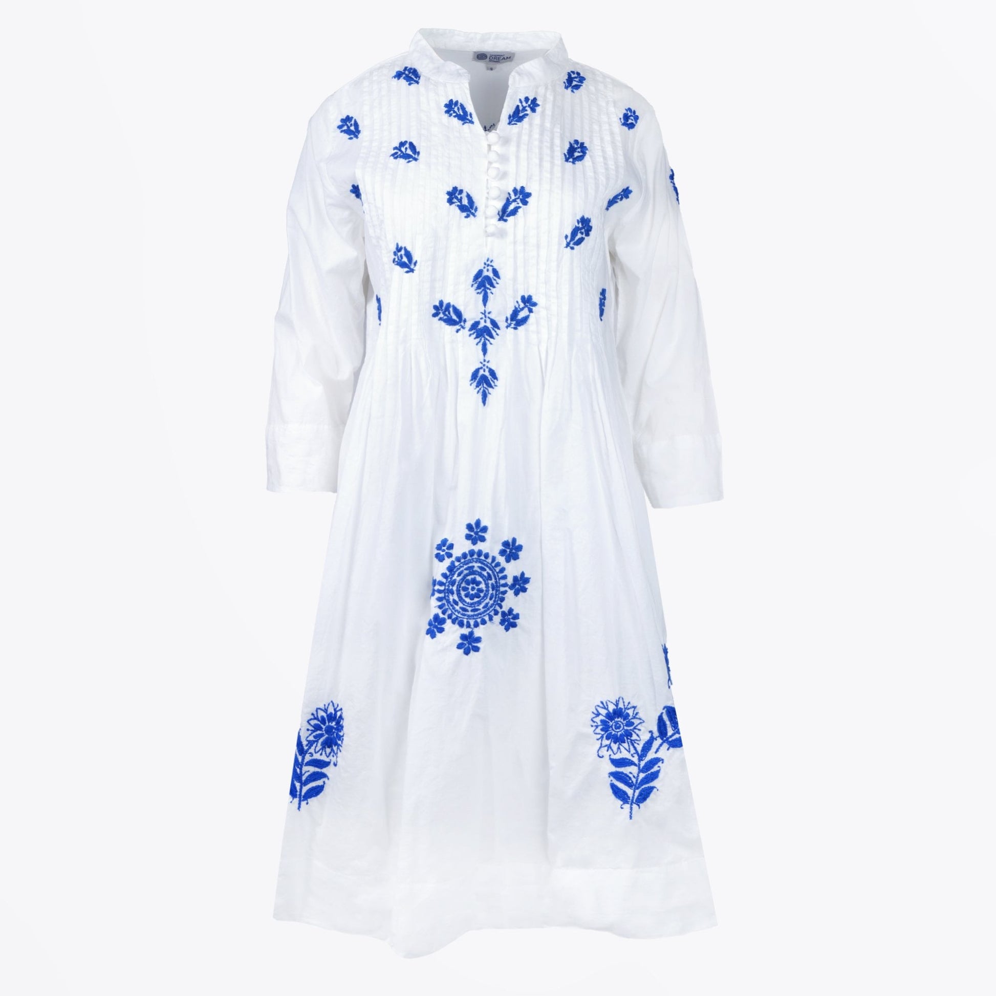 The new DREAM SS Collection reflects summer days and nights of an easy island life. Colourful yet simple and minimal, crafted from light weight seer cotton fabrics that delicately float with the breeze. This midi dress is the perfect dress to style up or down on your next holiday destination. This dress features a true blue botanical embroidery, with pintuck pleats at the chest and fabric covered button fastenings. Wear this dress with a statement colour shoe and a matching bag for a fun holiday outfit.