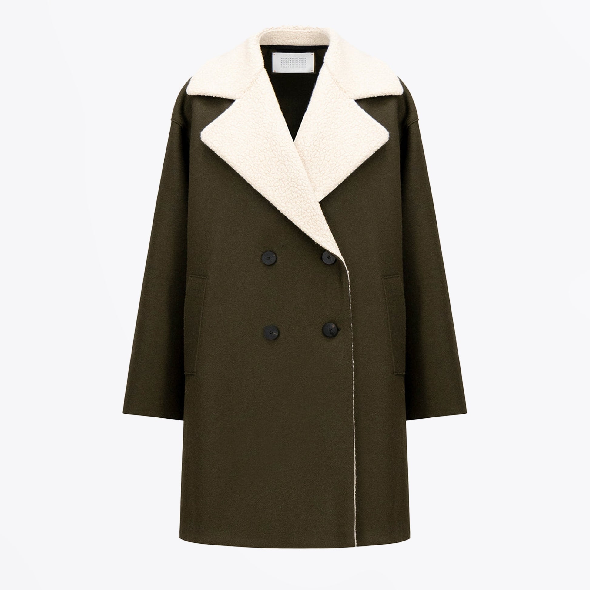 Harris Wharf conveys comfort and practicality ensuring you are protected from the elements and looking stylish. Using the finest Italian soft wools and felts this label artfully fuses traditional tailor techniques with modern designs. This coat is a great addition to any winter wardrobe, crafted from a khaki material with a borg textured trim interior and on the lapel. This coat has side pockets, chunky button fastenings and a double-breasted style. Wear this coat as part of your winter wardrobe rotation.