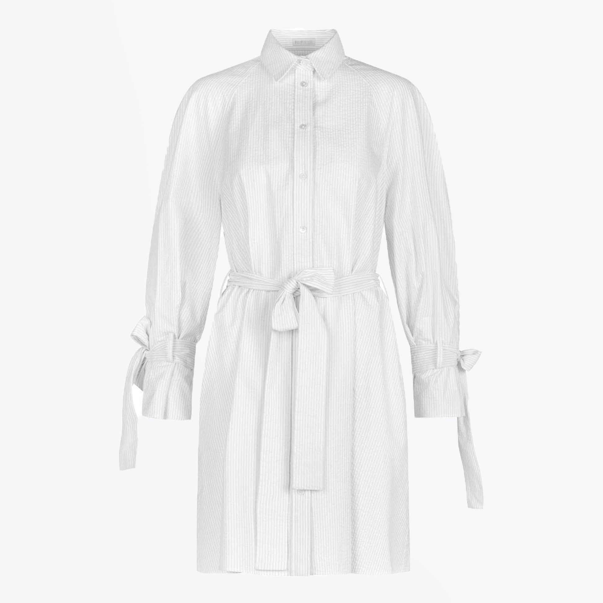 Harris Wharf conveys comfort and practicality ensuring you are protected from the elements and looking stylish. Using the finest Italian soft wools and felts this label artfully fuses traditional tailor techniques with modern designs This Striped dress in a white woven self stripe offers a soft textured handle and a comfortable fit. In addition this fresh spring dress features exaggerated bow sleeve details, wide cuffs, button-down front, a fabric belt with belt loops to emphasise the waistline and slit detail on the sleeve. A versatile and classic piece that will carry you through the transitional spring to summer months looking sophisticated and stylish!