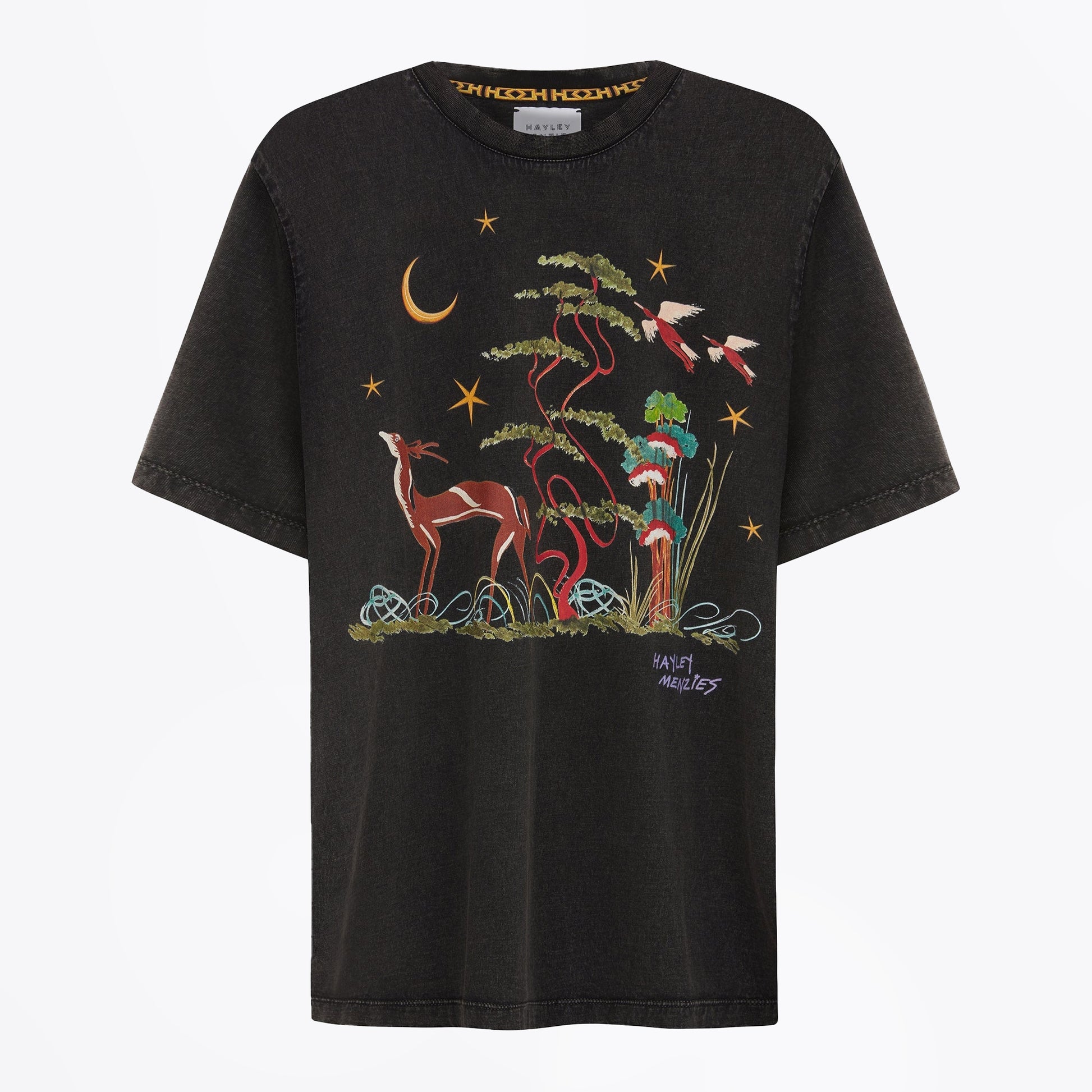 Taking inspiration from the kaleidoscope of beauty in nature and the glamorous hedonism of the past decades, Hayley Menzies is a is a luxury brand with a unique aesthetic, with a mindful approach to consumption. The brand has a beautiful artisanal pieces that are sure to be long loves in your wardrobe. Adding fun and playful details to your essential wardrobe pieces, this t-shirt features printed safari landscape on the chest. This t-shirt is crafted in a black cotton material, with a ribbed neckline, and short sleeves. Style this t-shirt with your favourite pair of straight leg jeans, and an A.P.C. bag for a beautiful summery look.