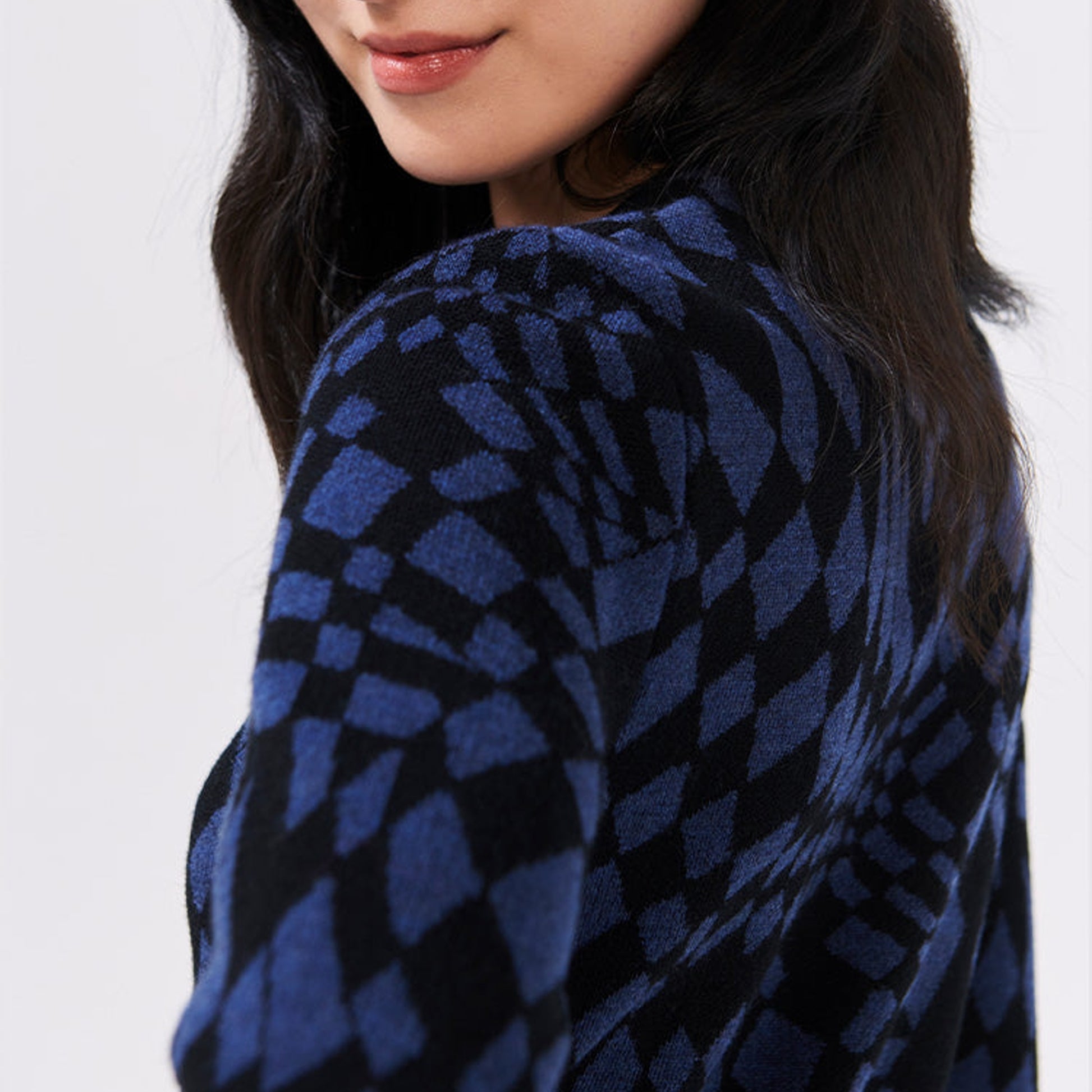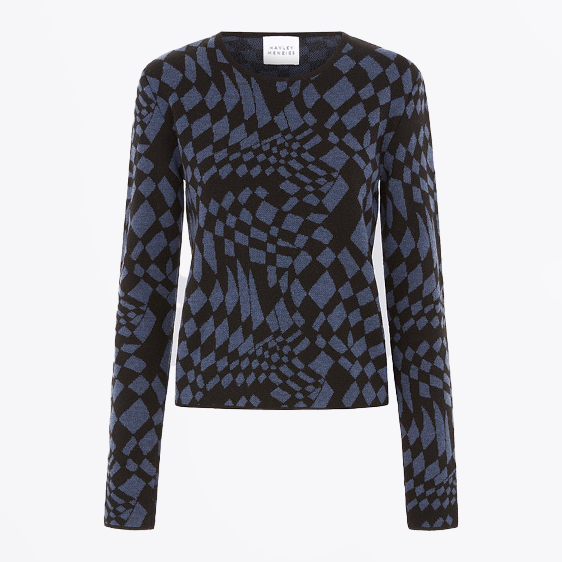 Taking inspiration from the kaleidoscope of beauty in nature and the glamorous hedonism of the past decades, Hayley Menzies is a is a luxury brand with a unique aesthetic, with a mindful approach to consumption. The brand has a beautiful artisanal pieces that are sure to be long loves in your wardrobe. This jumper features a check navy and black versatile design, long sleeves, and crew neckline. Style this jumper with a pair of Stine Goya trousers.