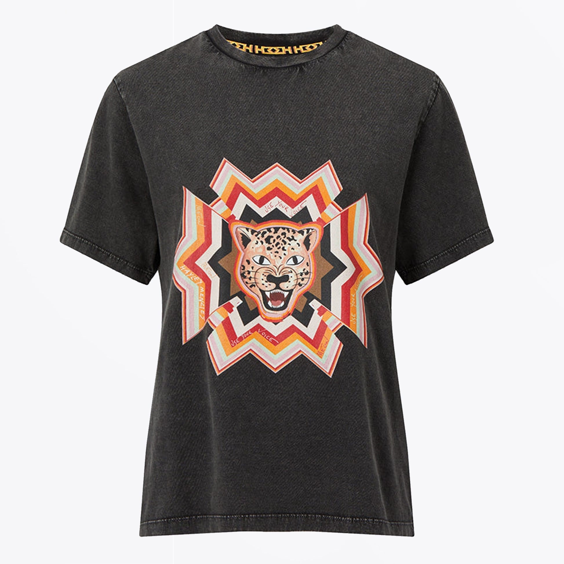 Taking inspiration from the kaleidoscope of beauty in nature and the glamorous hedonism of the past decades, Hayley Menzies is a is a luxury brand with a unique aesthetic, with a mindful approach to consumption. The brand has a beautiful artisanal pieces that are sure to be long loves in your wardrobe. This black Psychedelic Leopard T-Shirt is a bold basic, it also includes an ousting bold aesthetic, a bold motif, crew neck, short sleeves slouchy fit. Style this tee with a cool pair of Paige jeans.