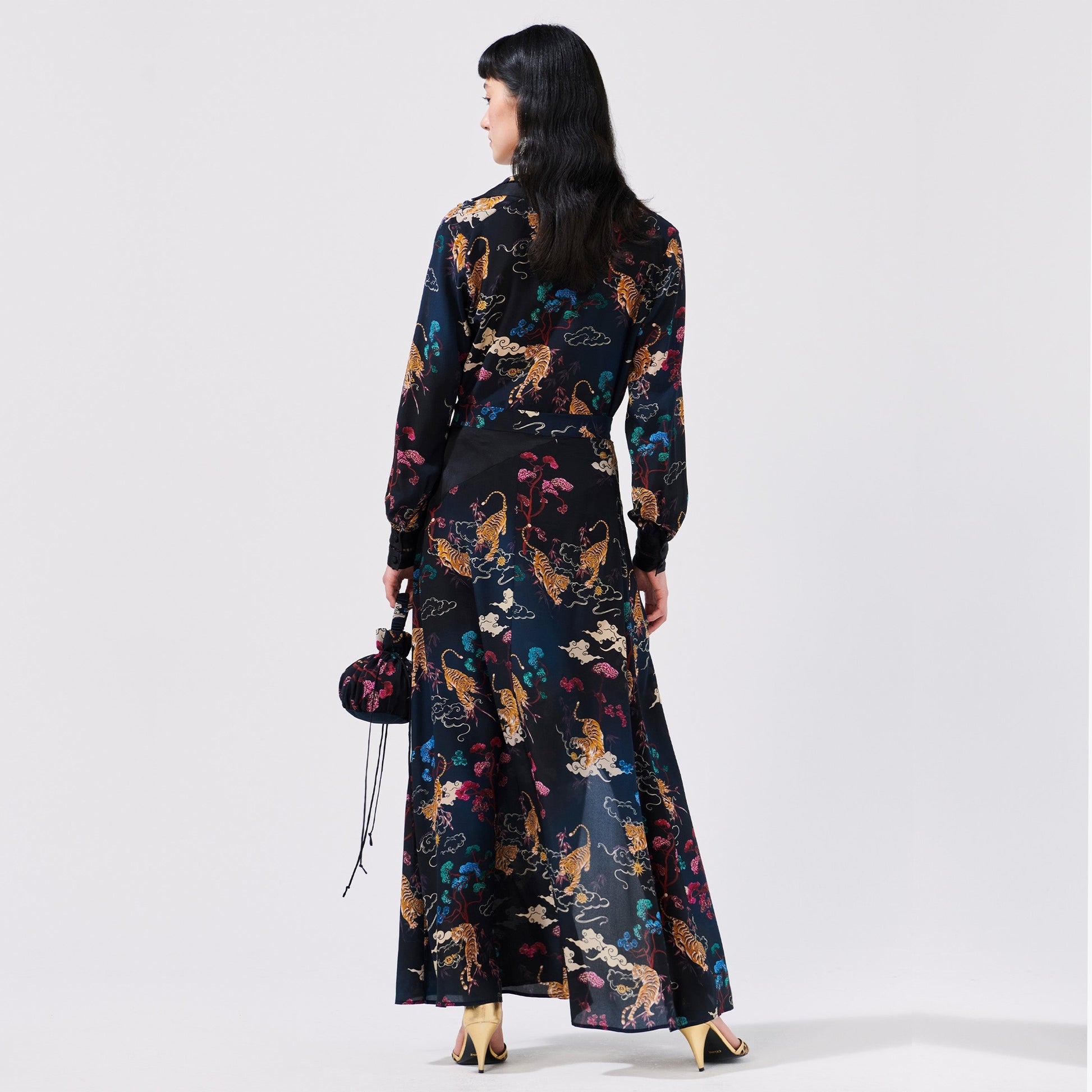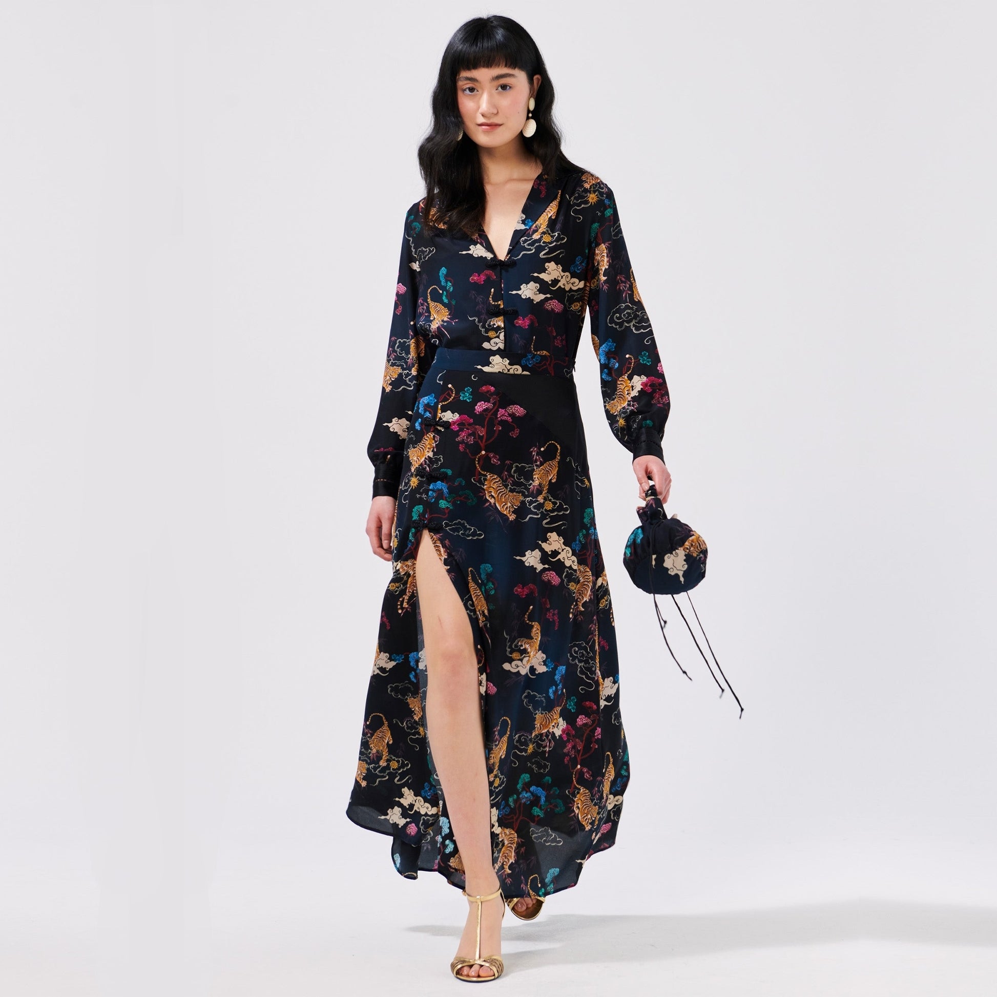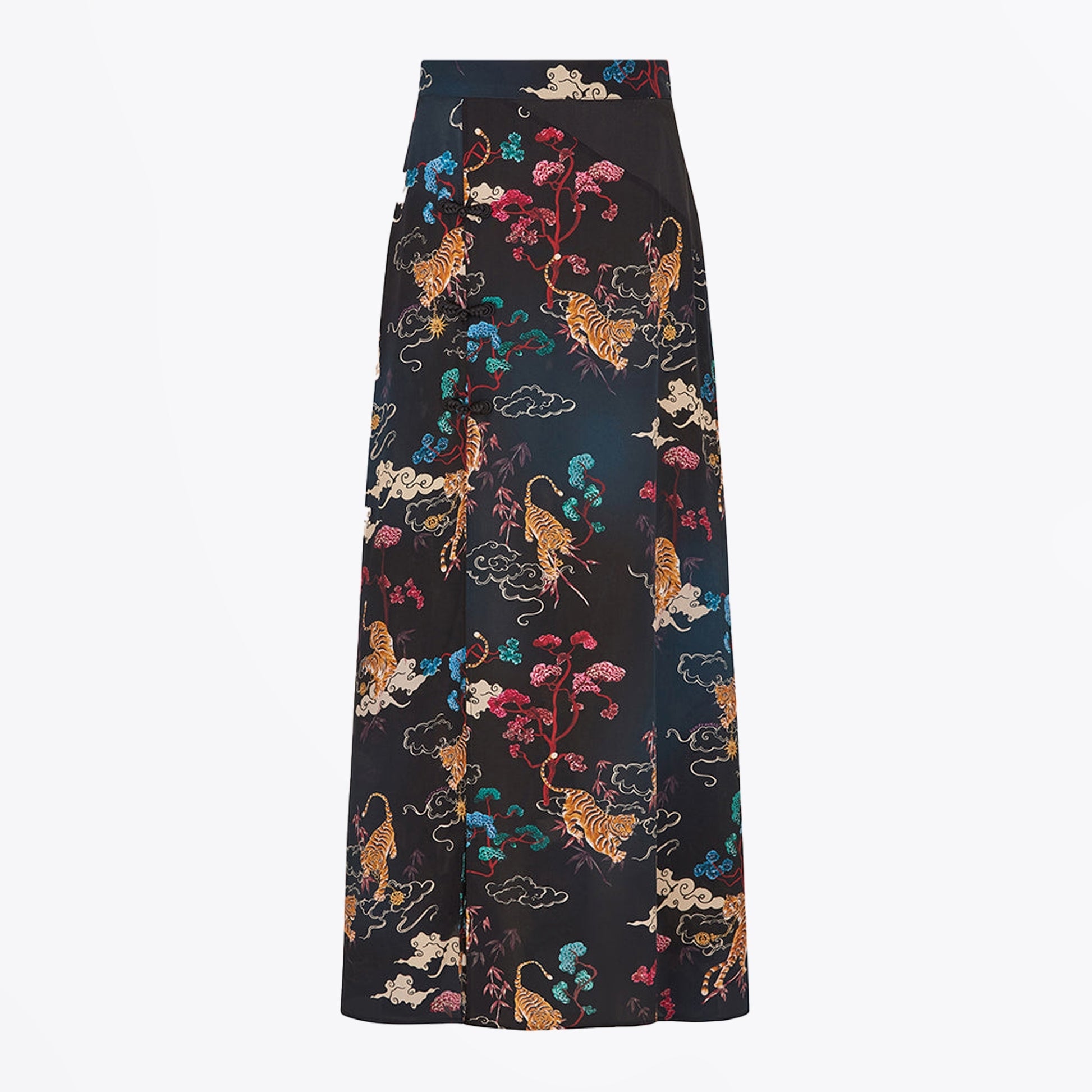 Taking inspiration from the kaleidoscope of beauty in nature and the glamorous hedonism of the past decades, Hayley Menzies is a is a luxury brand with a unique aesthetic, with a mindful approach to consumption. The brand has a beautiful artisanal pieces that are sure to be long loves in your wardrobe. This silk split skirt features a detailed design including tigers roaming wild surrounded by lush mid – century chinoiserie print. It also includes a suggestive thigh slit and a high waist. Style this skirt with the pairing Hayley Menzies blouse.