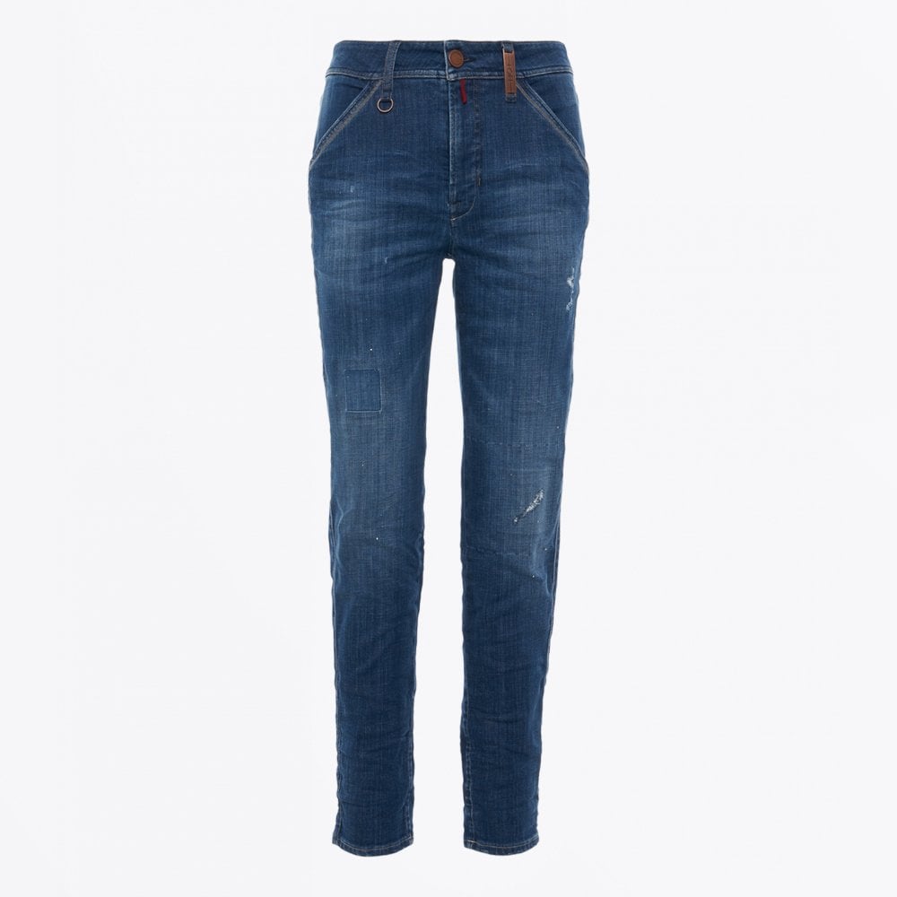 High by Claire Campbell offers innovative and premium clothing that encompasses the female silhouette. Volume and layering are the key approaches adopted by High to create the polished, sophisticated and feminine look that we all covet. Crafted in a blue cotton denim the Admit jeans showcases an abraded surface, inset patches and "torn" details creating a vintage worn effect. These medium-weight jeans with soft surface offer single copper button waistband faced with mini-gingham and belt loops over fly front fastened silver metal zip. The reverse has V-back yoke and two patch back pockets. Hem turns up to show contrast cream and red binding.