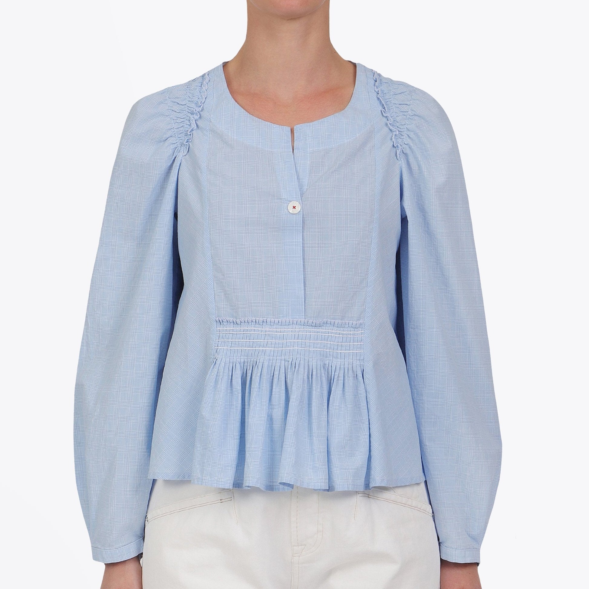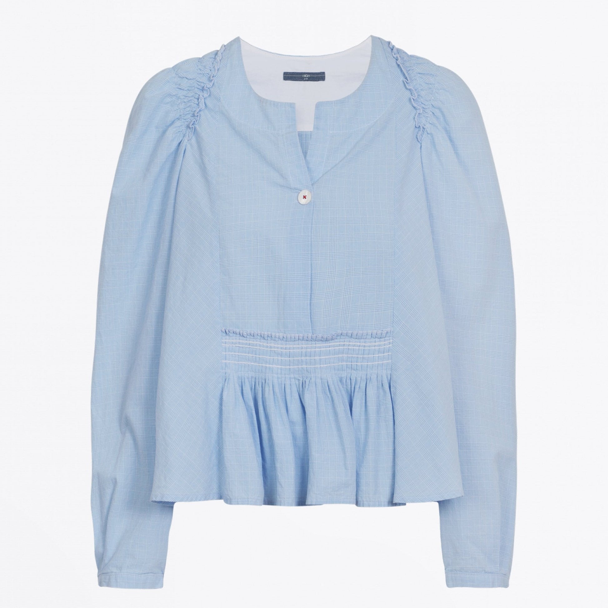 High by Claire Campbell offers innovative and premium clothing that encompasses the female silhouette. Volume and layering are the key approaches adopted by High to create the polished, sophisticated and feminine look that we all covet. This Amicable full flare top in pale blue and white mini-pow check poplin is made from 100% cotton with wide open-neck and v-neck opening at the front over a mother-of-pearl button. This lightweight shirt features vertical pintucks creating a front frill peplum and a curved hem that drapes longer at the back. Subtle details include a full flaring back panel and long sleeves with a narrow button cuff.This top is the embodiment of modern and forward-thing high fashion.