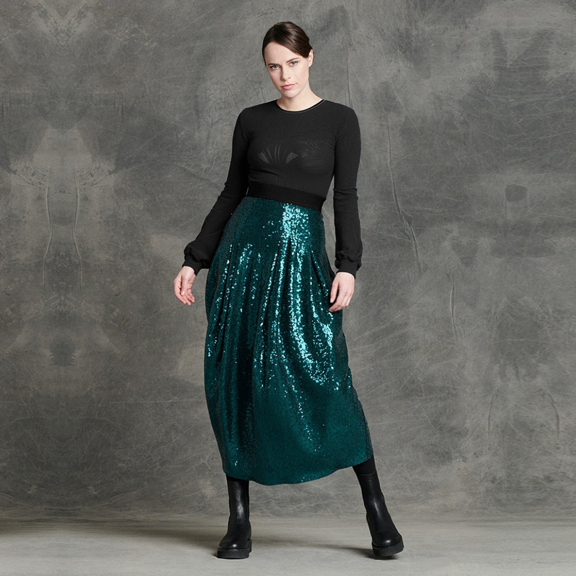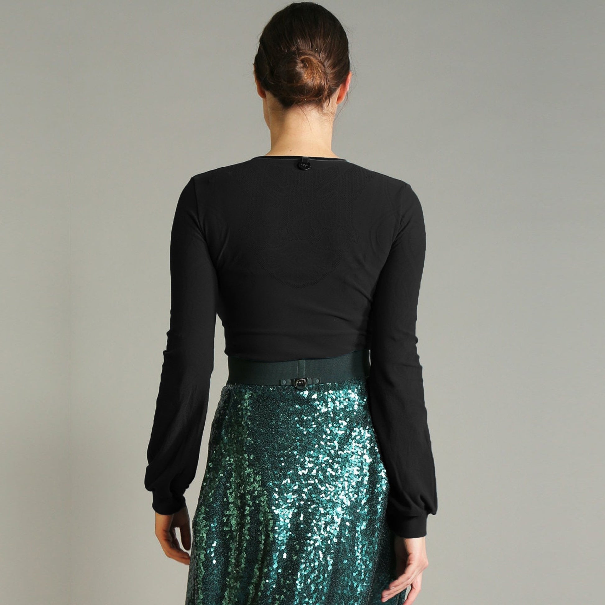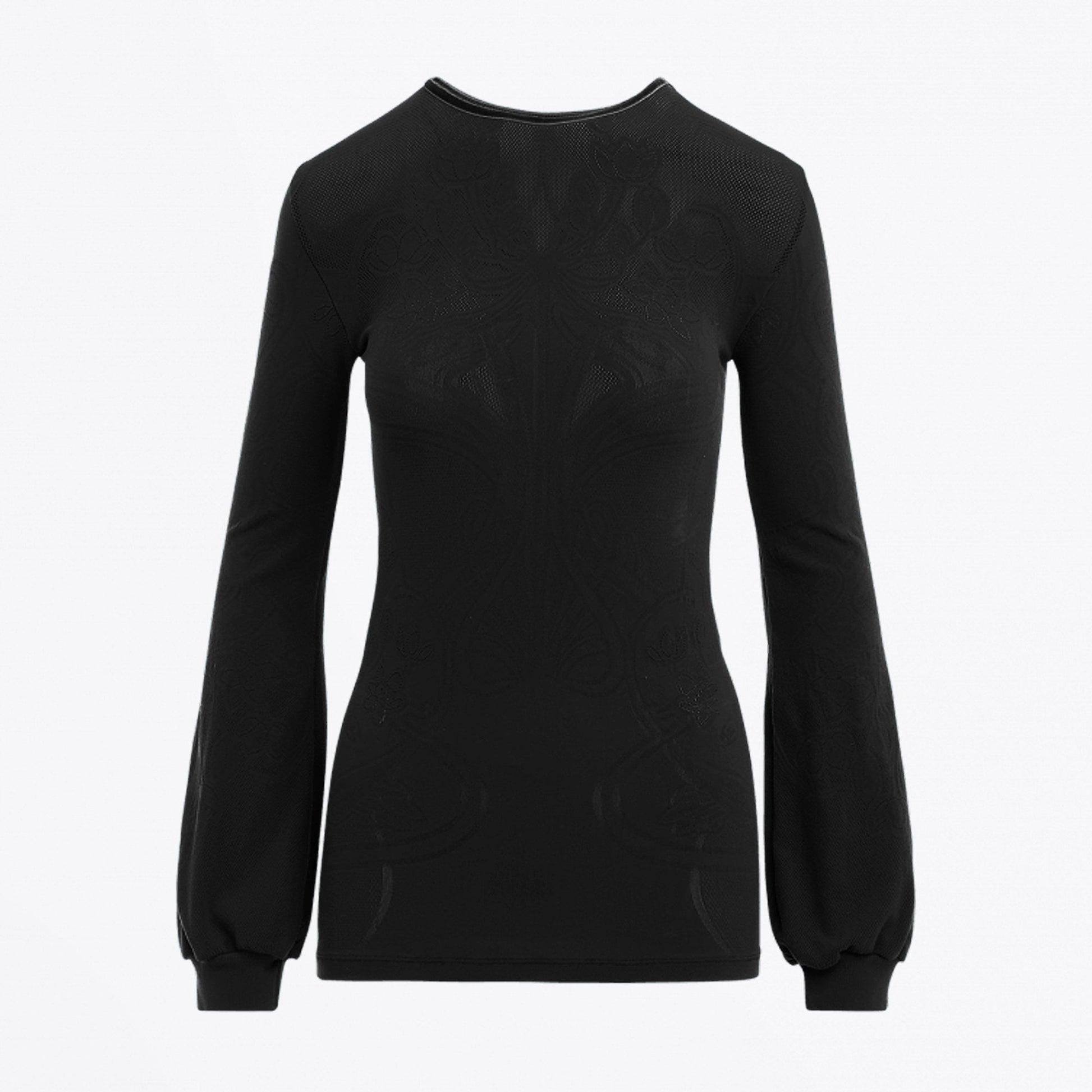 High by Claire Campbell offers innovative and premium clothing that encompasses the female silhouette. Volume and layering are the key approaches adopted by High to create the polished, sophisticated and feminine look that we all covet. This self pattern knit sweater in black fine seamless semi-sheer curlicue patterned technical stretch knit. Round neckline edged in tech velvet. Long inset bell-shape sleeves flare out below elbow and are gathered into rib knit cuffs. Extra slim fit body shape. Straight hem.