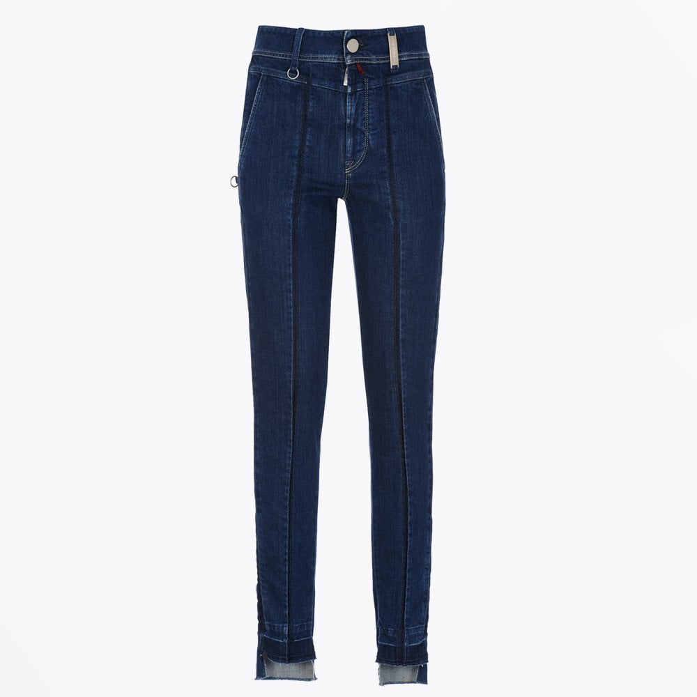 Mid rise jeans in mid blue denim. Waistband has belt loops, silver metal chain hoops, stud and button over silver metal fly front with contrast red edge stitching and keeper. Front yoke with slanting side pockets. Front crease and side seam has "stitch-and-release" darker stripe. Reverse has back yoke and two back patch pockets. Hem has raw edge and is cut-out and "altered" across front.