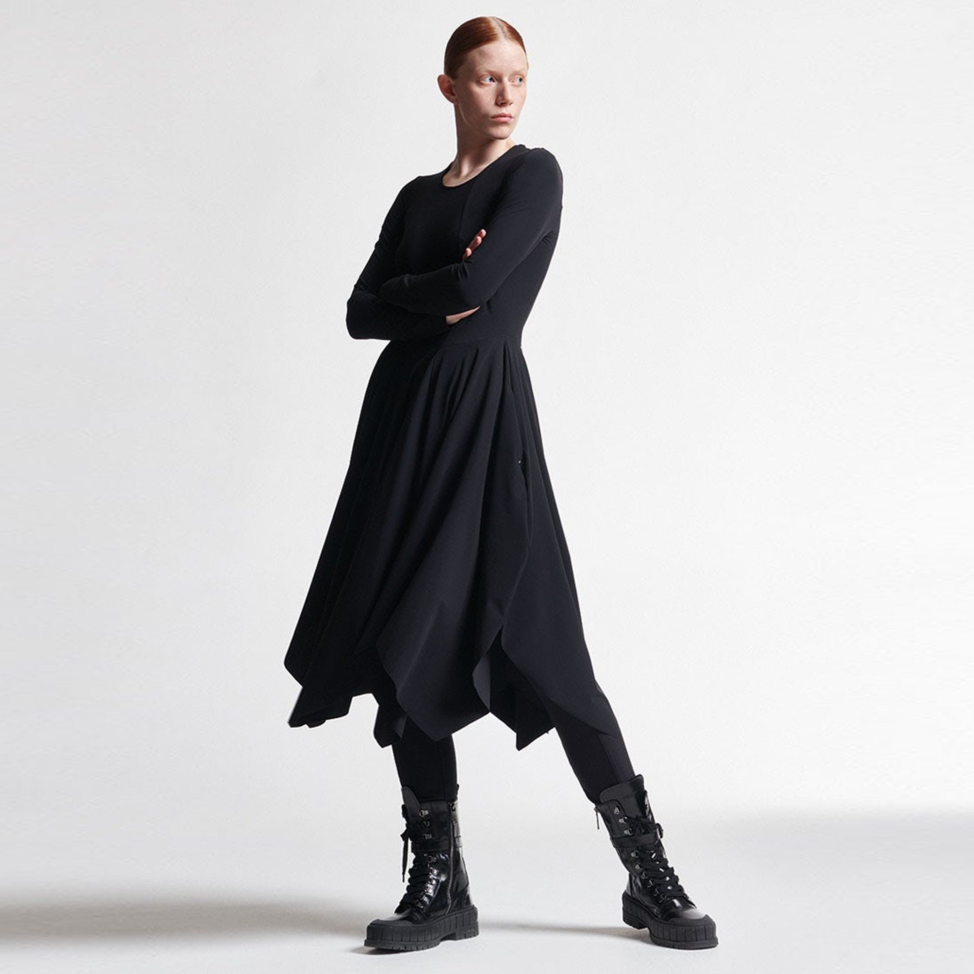 High by Claire Campbell offers innovative and premium clothing that encompasses the female silhouette. Volume and layering are the key approaches adopted by High to create the polished, sophisticated, and feminine look that we all covet. Add interesting shape to your designer wardrobe with this option from High. This dress features a rounded neckline, slim bodice, long slim inset sleeves, straight cuffs, inseam pockets complete with raw cut them. . Wear this dress with a pair of designer footwear.