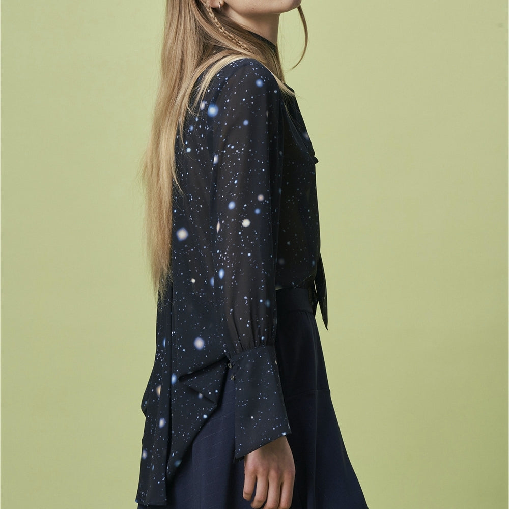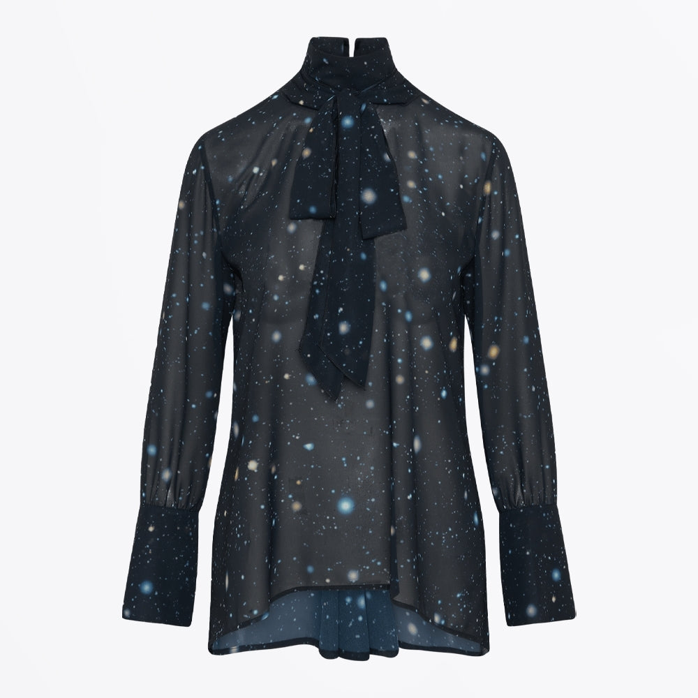 High by Claire Campbell offers innovative and premium clothing that encompasses the female silhouette. Volume and layering are the key approaches adopted by High to create the polished, sophisticated, and feminine look that we all covet. Add interesting shape to your designer tops with this option from High. This top features a “galaxy” print throughout the top, soft collar neckline, button fastening at the collar on the back of the top, keyhole opening on the back, a neck wrap around the collar, long split cuffs and a curved hem.