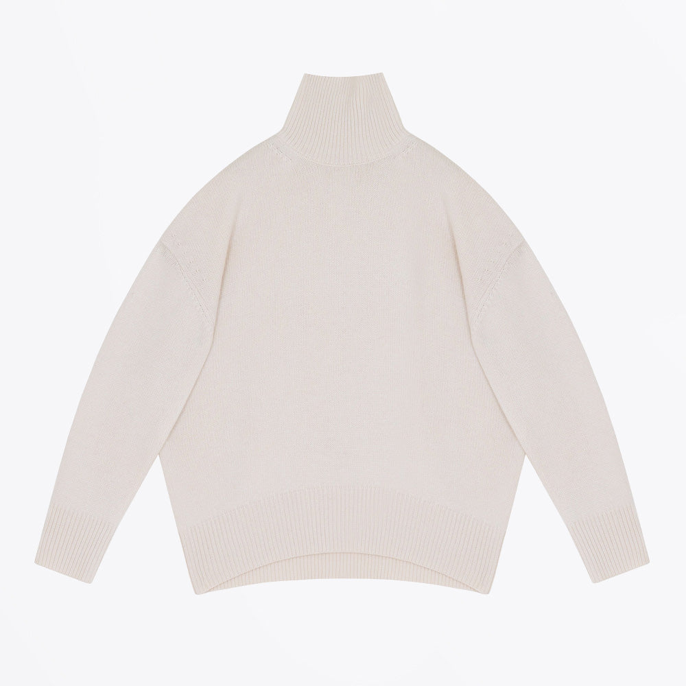 Update your fall wardrobe with our Cream High Neck Jumper. This slouchy, oversized sweater is perfect for cold weather and features a turtleneck design for added warmth. The cream color adds a touch of elegance, while the logo on the back adds a subtle branding detail. Stay cozy and stylish all season long.