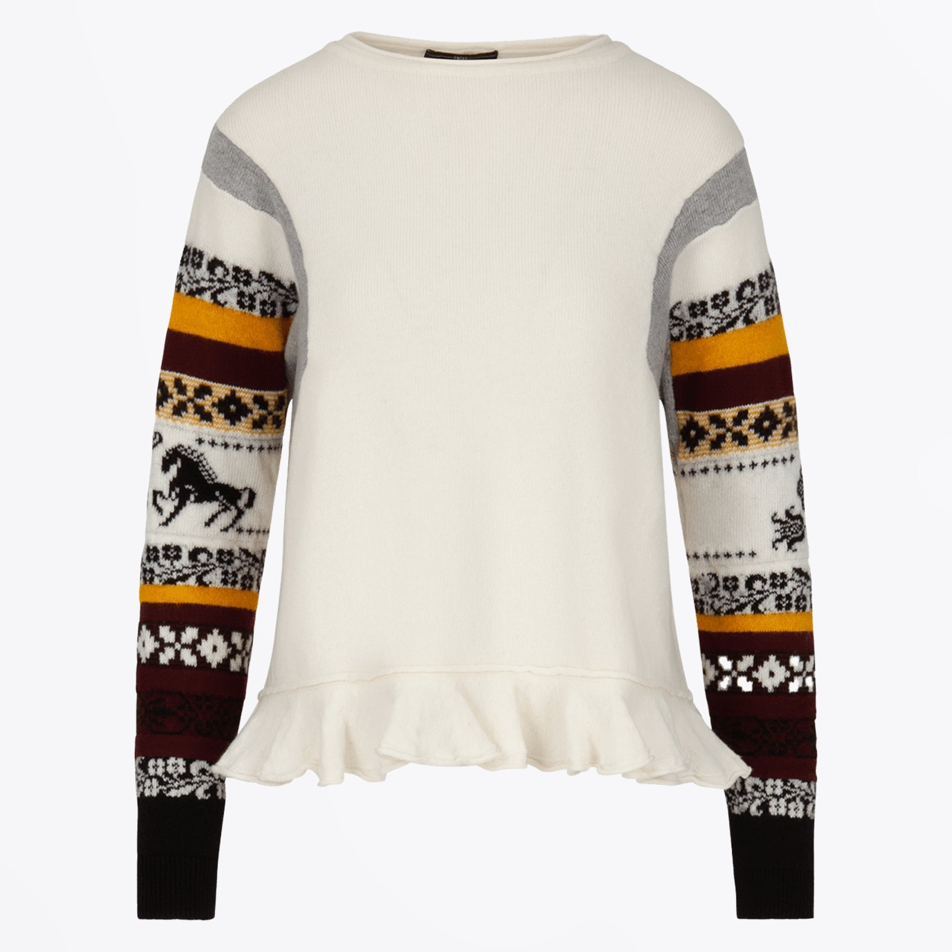 High by Claire Campbell offers innovative and premium clothing that encompasses the female silhouette. Volume and layering are the key approaches adopted by High to create the polished, sophisticated, and feminine look that we all covet. Add interesting shape to your designer wardrobe with this option from High. This sweater features a geometrical designs on the sleeves, round neckline, ribbed cuffs, flared hem and squared arm holes. Wear this with some Paul Smith trousers and Veja trainers
