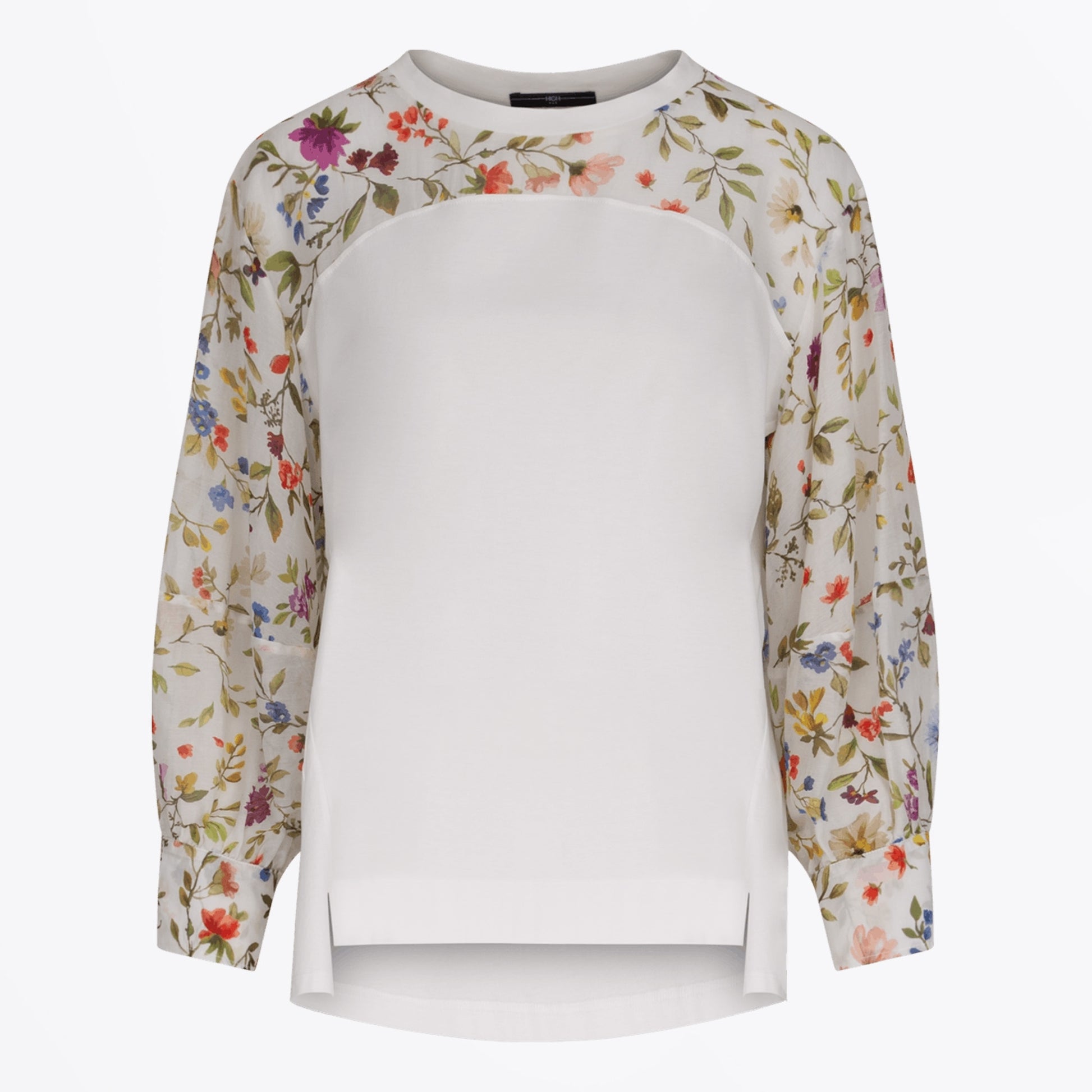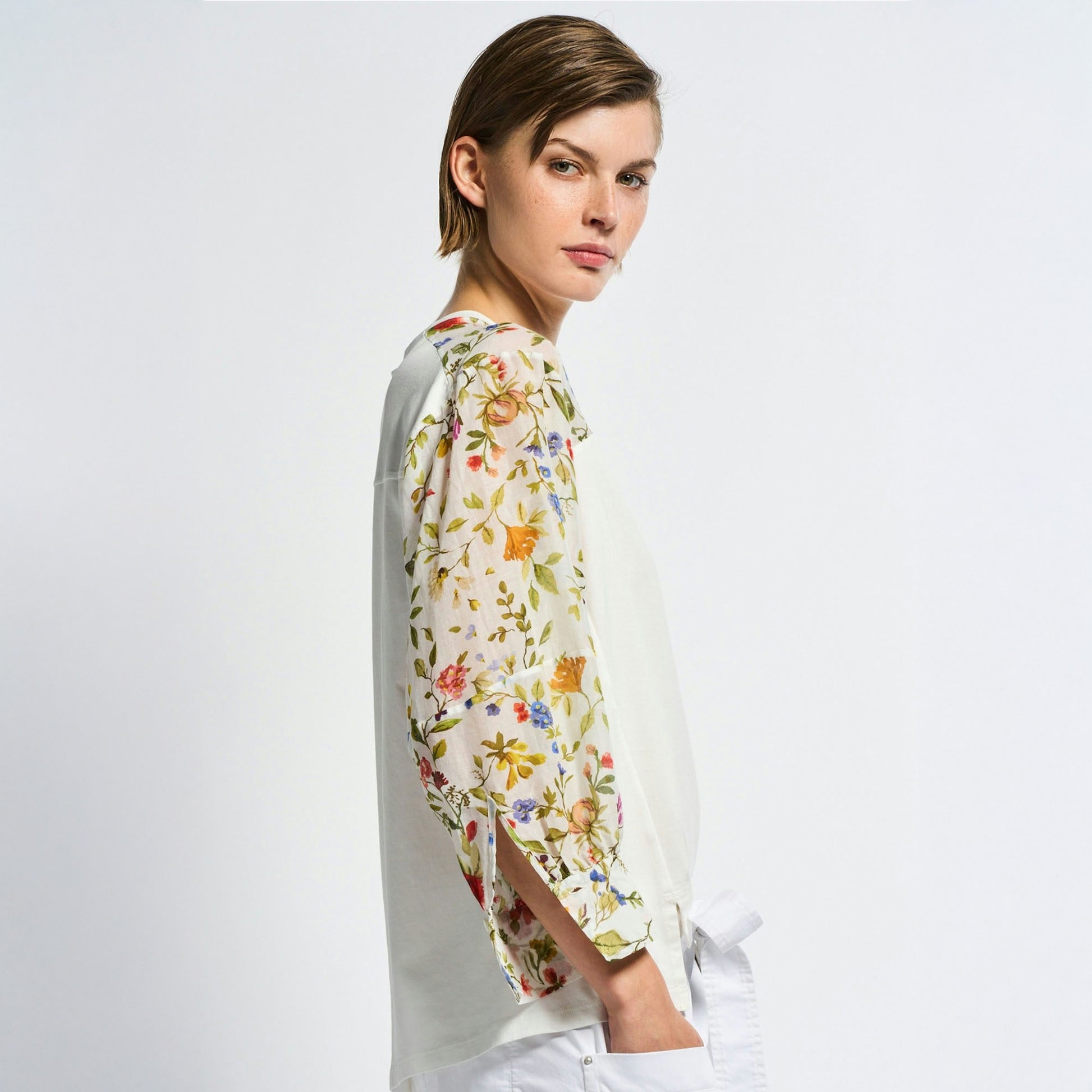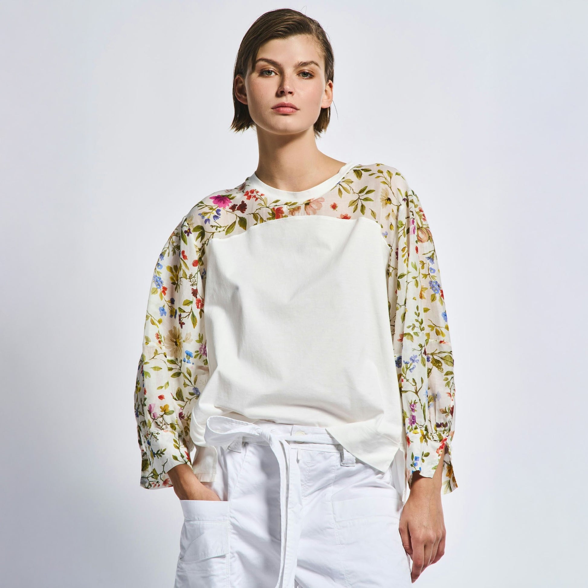 High by Claire Campbell offers innovative and premium clothing that encompasses the female silhouette. Volume and layering are the key approaches adopted by High to create the polished, sophisticated, and feminine look that we all covet. Add interesting shape to your designer wardrobe with this option from High. This Prosaic long sleeve t-shirt is designed in a clean cotton jersey. The top also includes a dropped shoulder, bell sleeve in a lightweight semi sheer floral printed cotton and silk, hem finished with self fabric and a single button on the cuff. Wear this top with a pair of Paige jeans and a pair of Veja sneakers.