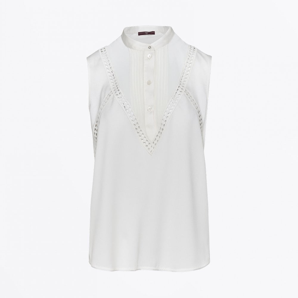 High by Claire Campbell offers innovative and premium clothing that encompasses the female silhouette. Volume and layering are the key approaches adopted by High to create the polished, sophisticated and feminine look that we all covet. This sleeveless ivory Quiver top in tech cr��pe features inset bands of ribbon lace creating a V-shape "bib" front and low stand collar on a button-thru placket with pin tucks either side armholes bound in self fabric. The back of this top has an across back yoke with gathering at the centre back and gently flaring hem drapes into longer curve at back.