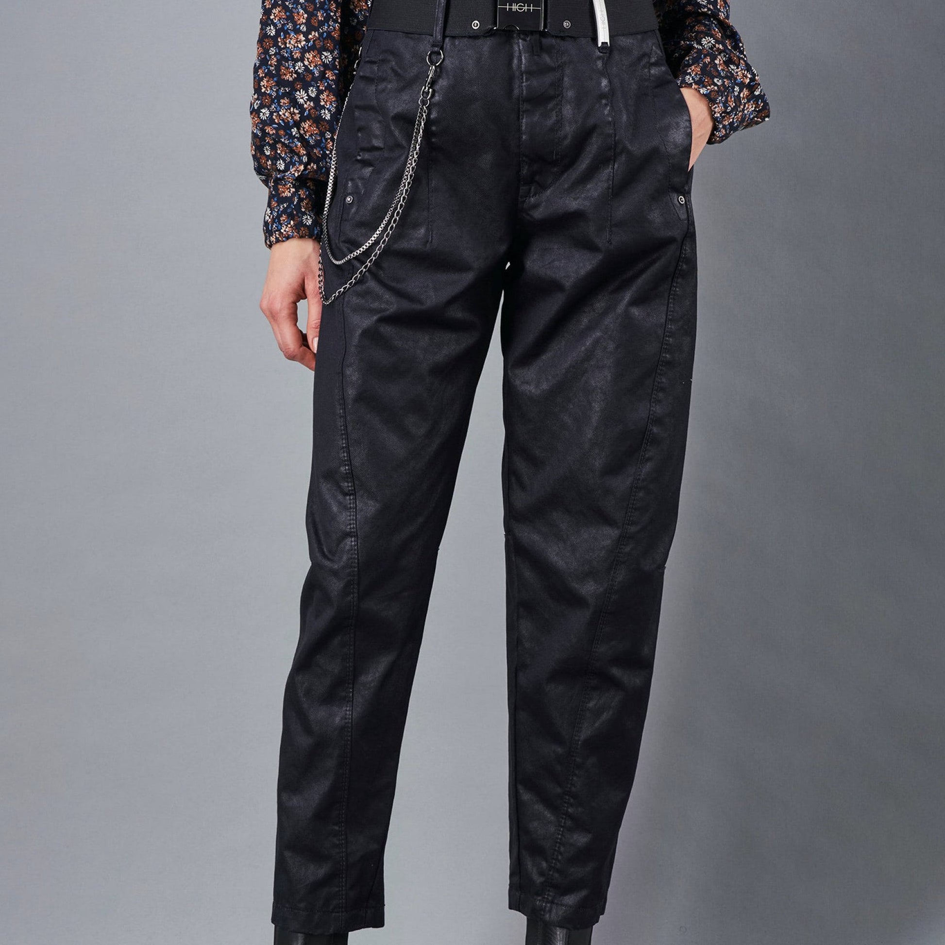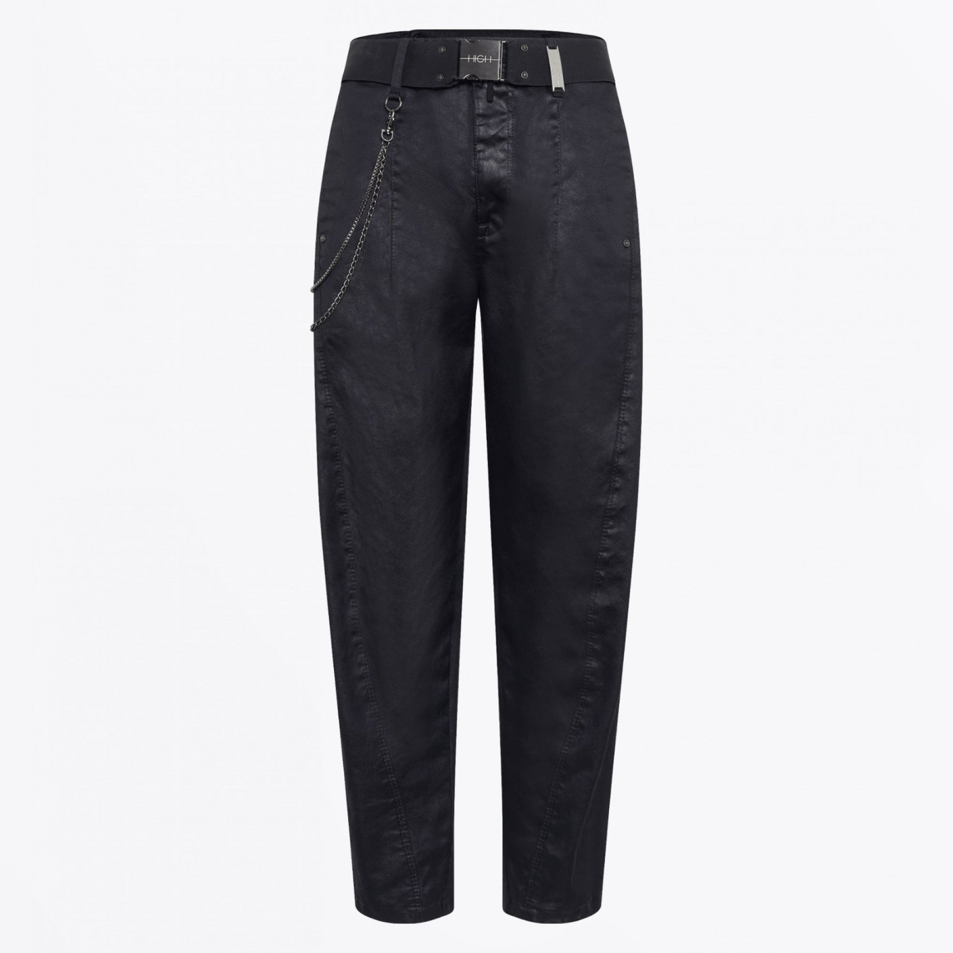 High by Claire Campbell offers innovative and premium clothing that encompasses the female silhouette. Volume and layering are the key approaches adopted by High to create the polished, sophisticated, and feminine look that we all covet. Add an edge to your outfits this season with these waxed cotton trousers. Crafted with a tapered leg, these trousers feature a branded belt and detachable double chain, with side pockets, silver rivets and front darts. Wear these trousers with a fitted tee and some Veja trainers.