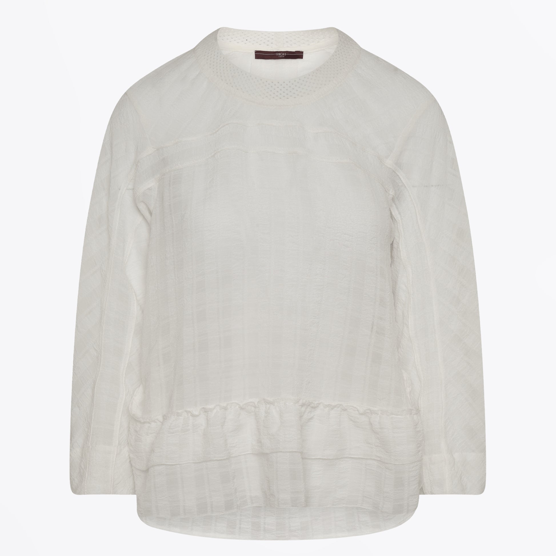 High by Claire Campbell offers innovative and premium clothing that encompasses the female silhouette. Volume and layering are the key approaches adopted by High to create the polished, sophisticated, and feminine look that we all covet. Add interesting shape to your designer wardrobe with this option from High. This top features a round neckline, a semi sheer tech chiffon seersucker, full sleeves with wide straight cuffs and a front panel finished with double band of gathered on ruffles. Wear this dress with your favourite designer trousers and designer footwear.