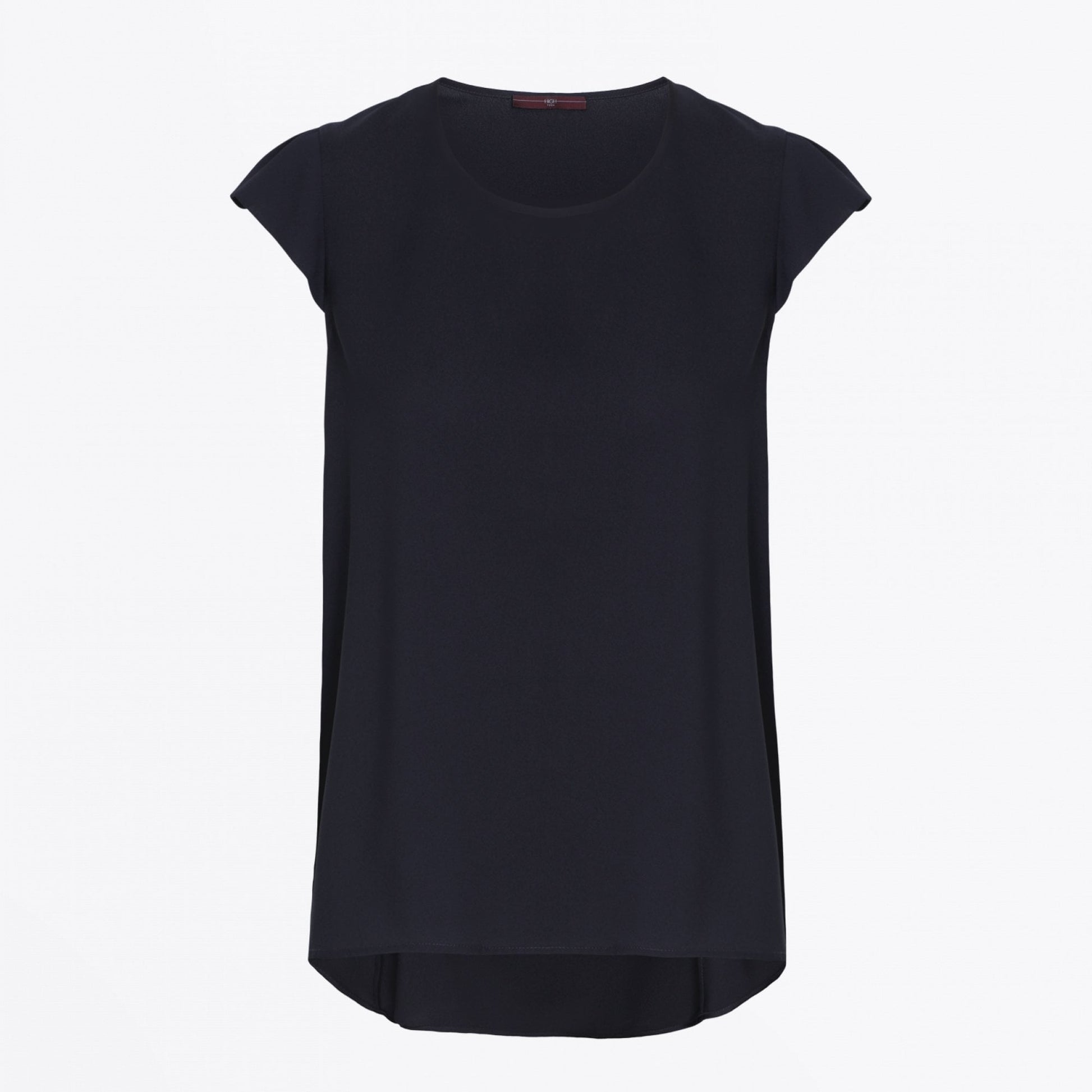 High by Claire Campbell offers innovative and premium clothing that encompasses the female silhouette. Volume and layering are the key approaches adopted by High to create the polished, sophisticated and feminine look that we all covet. This cap sleeve top in navy is made from a technical satin with inset side body panels to create a fullness. This wide round-neck top features short gathered cap sleeves in tech georgette and a full flared hem that is straight in the front and curves longer at the back. This top is the embodiment of modern and forward-thing high fashion.