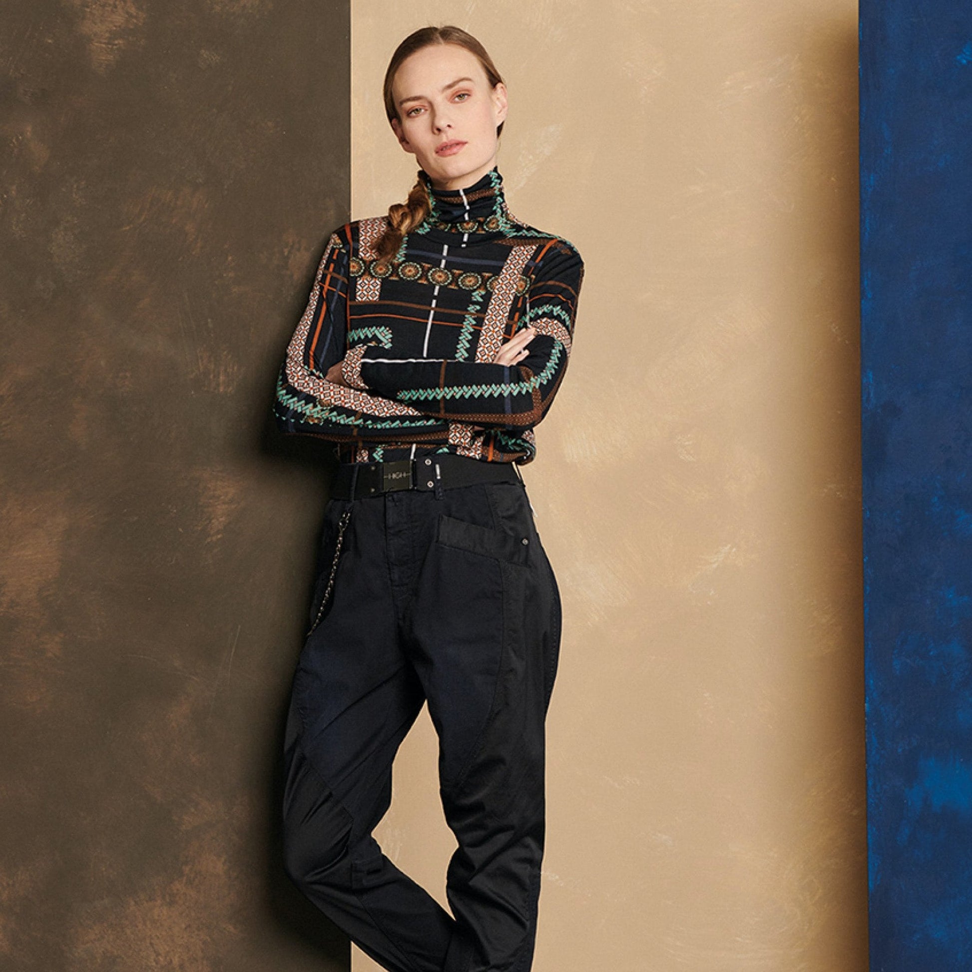 High by Claire Campbell offers innovative and premium clothing that encompasses the female silhouette. Volume and layering are the key approaches adopted by High to create the polished, sophisticated and feminine look that we all covet. Add some interesting pattern to your daily outfits this season with this high neck jersey top. This top features a multi-coloured geometric print, on a soft jersey material, with mother of pearl buttoned cuffs and a roll high neckline. Wear this top with a pair of wide leg Paige jeans and some designer trainers for a great daily outfit.