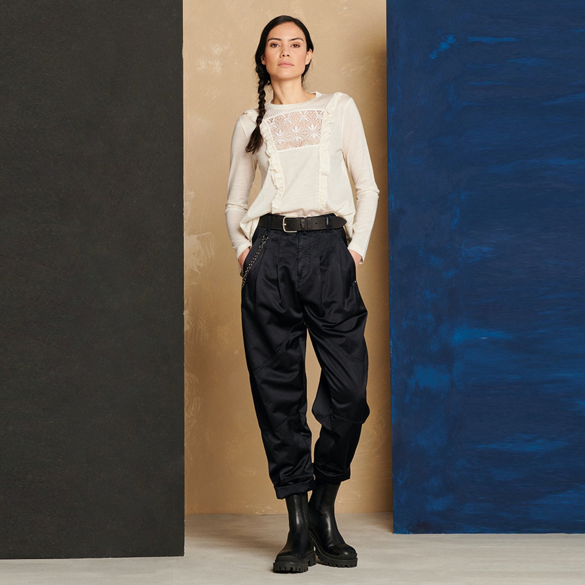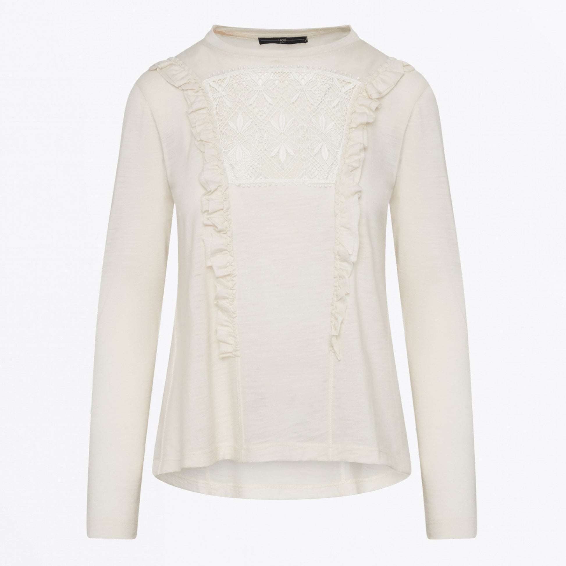 High by Claire Campbell offers innovative and premium clothing that encompasses the female silhouette. Volume and layering are the key approaches adopted by High to create the polished, sophisticated and feminine look that we all covet. This long sleeve flare-out top in pure wool jersey with a round neckline bound in self-fabric. A-line body has long sleeve slim inset sleeves finishing in straight cuffs. Fronts have an inset panel of semi-sheer lace below front neck between curved fit seams from shoulder to hem with inset double ruffles tapering from shoulder to waist with a  full hem which curves longer at the back.