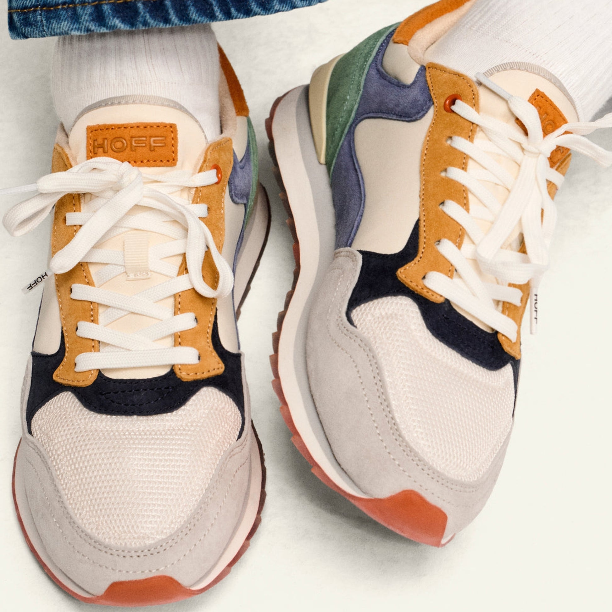 Taking inspiration from iconic cities and places across the world, Hoff is truly a global brand. One of our newer brands at Mr and Mrs Stitch, we fell in love with their mastery of merging interesting colours and contrasting textures to create pure art for your feet. These ‘Bangkok’ style trainers take inspiration from the city itself, these trainers feature a merge of cool and warm toned colours on an off-white textile base. With lace up details these shoes also boast a rubber sole with a printed graphic using images inspired by Bangkok itself. Wear these trainers with any of your favourite outfits for a pop of colour.
