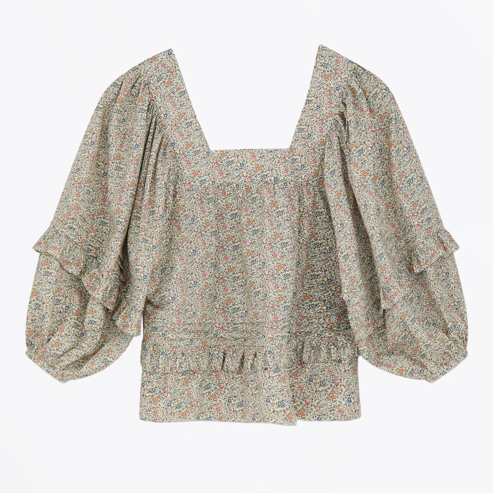 Elevate your wardrobe with this Skall Studio Hope Blouse, a sophisticated three-quarter sleeve design crafted from 100% organic cotton Liberty fabric. The striking square neckline and low back create an elegant silhouette, while delicate pleats and ruffle details add movement and visual interest. Perfect for layering or wearing solo, this versatile piece transitions seamlessly from day to evening. Produced in Romania with care for both quality and sustainability. Machine wash at max. 30 degrees to preserve the fabric's beauty.