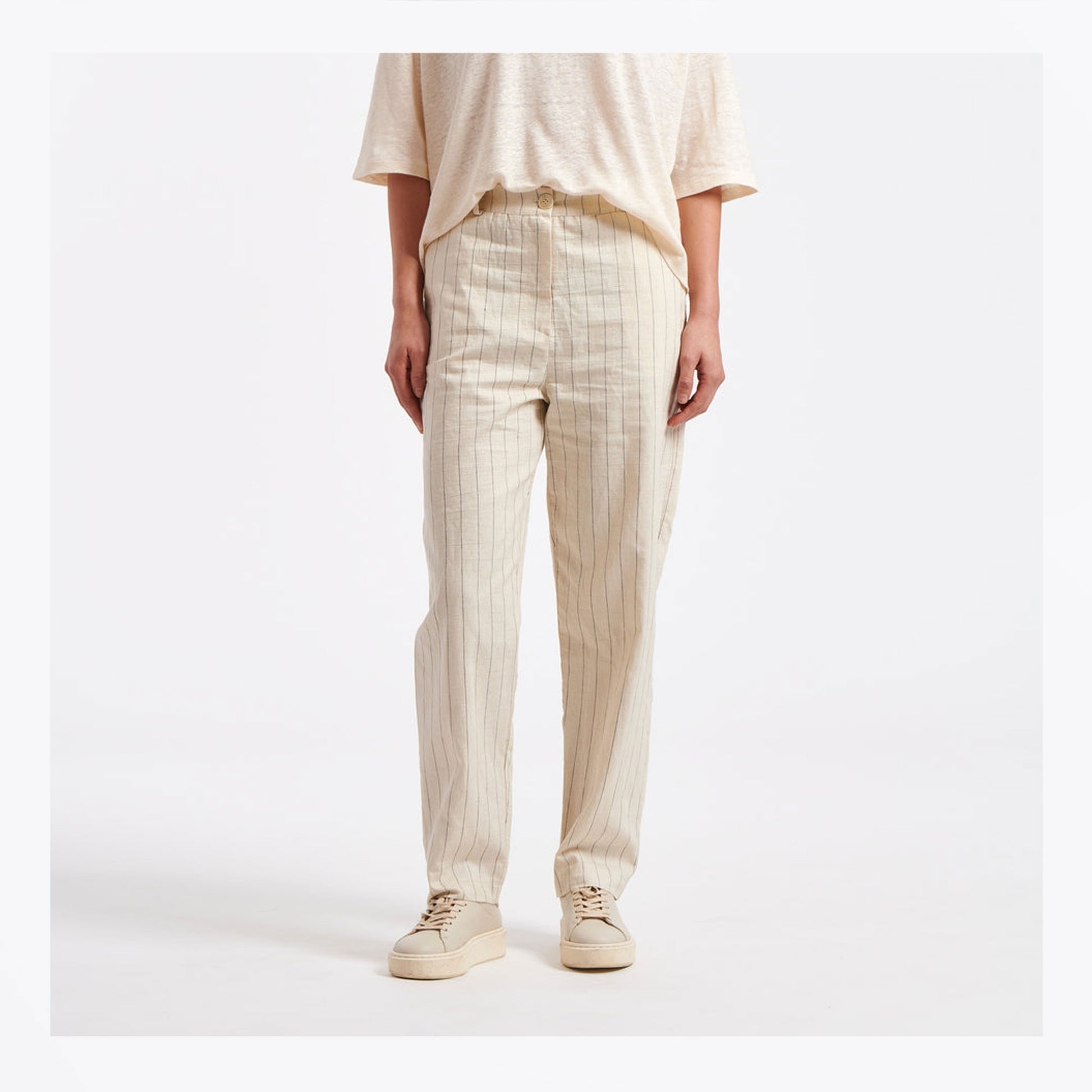 Humility conveys contemporary, comfort and practicality in her designs. The flexibility in mixing and matching fabrics and masterfully cut lines complement the female silhouette exquisitely. Update your summer essentials with this lightweight option from Humility. Crafted in a linen and cotton blend, this Bart trouser features a pinstripe design, button and fly closure, two side pockets with a stitched Humility logo on the back. Style these with a Benson coat and some Veja sneakers.