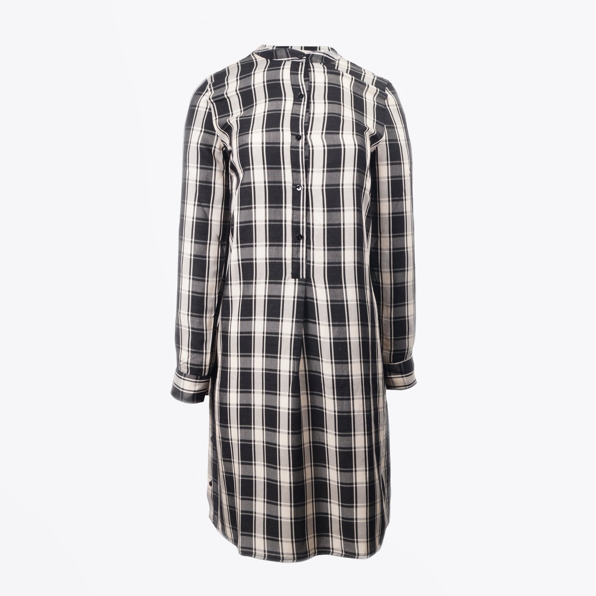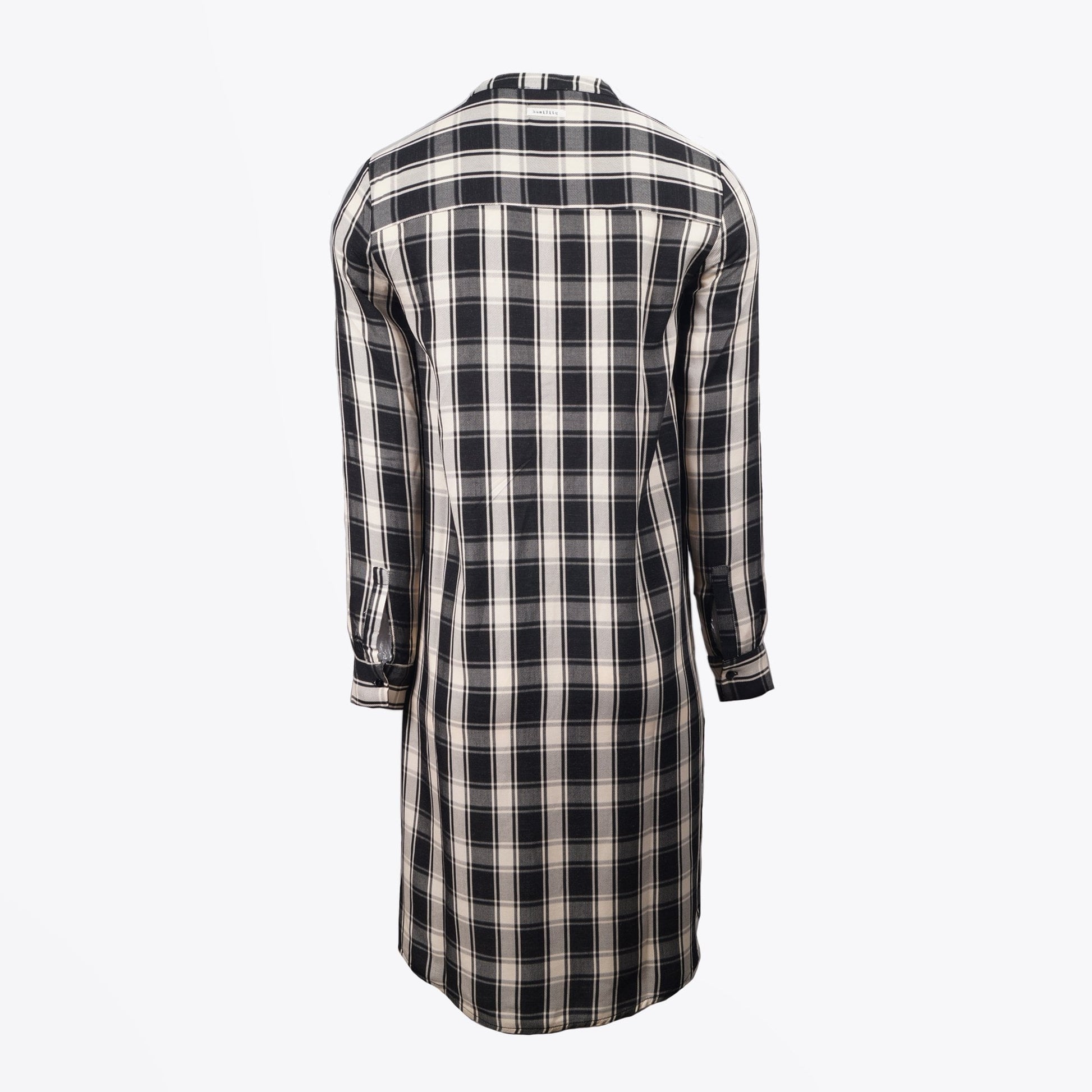 Humility conveys contemporary, comfort and practicality in her designs. The flexibility in mixing and matching fabrics and masterfully cut lines complement the female silhouette exquisitely. This beautiful dress has been cut to drape beautifully on the female form. With a high neckline and mandarin-style collar this dress with checked print offers lots of movement and a super soft cotton handle providing a comfortable fit and stylish look. Finishing touches include a half button-down front, button detailing on the hem and long sleeves with one-button cuff.