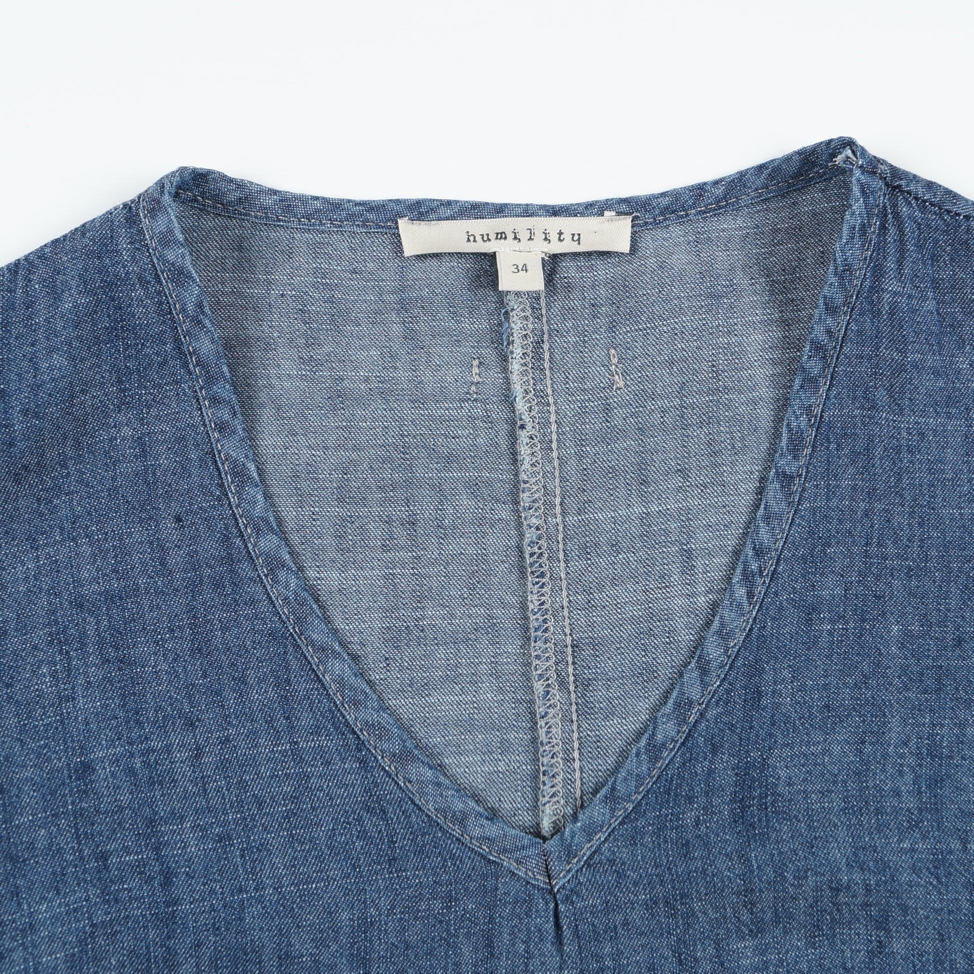 Humility conveys contemporary, comfort and practicality in her designs. The flexibility in mixing and matching fabrics and masterfully cut lines complement the female silhouette exquisitely. Update your summer dresses with this lightweight option from Humility. Crafted in a lightweight denim material, this sleeveless dress has a v-neckline, in an A-line shape, and with side pockets. Style this dress with a designer jacket and a pair of Veja’s for a great casual look.