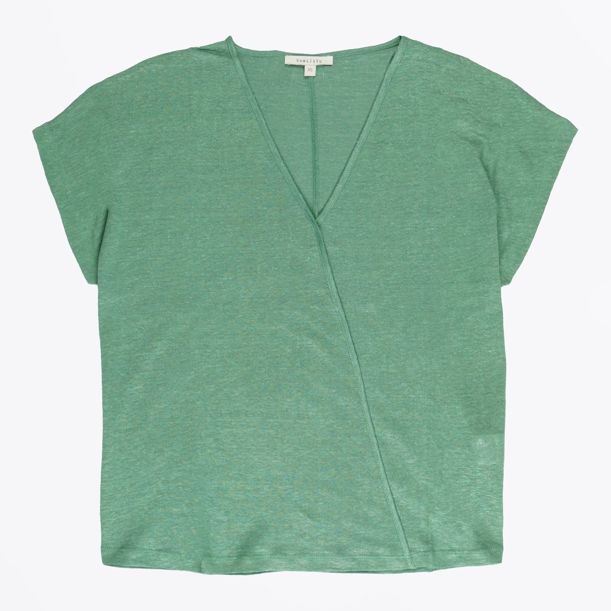 Humility conveys contemporary, comfort and practicality in her designs. The flexibility in mixing and matching fabrics and masterfully cut lines complement the female silhouette exquisitely. Update your summer essentials with this lightweight option from Humility. Crafted in a linen material, this green t-shirt features a v-neckline, with a diagonal front seam, seamless short sleeves, and straight hems. Style this top with a pair of your favourite designer jeans and some Hoff trainers for a touch of colour.