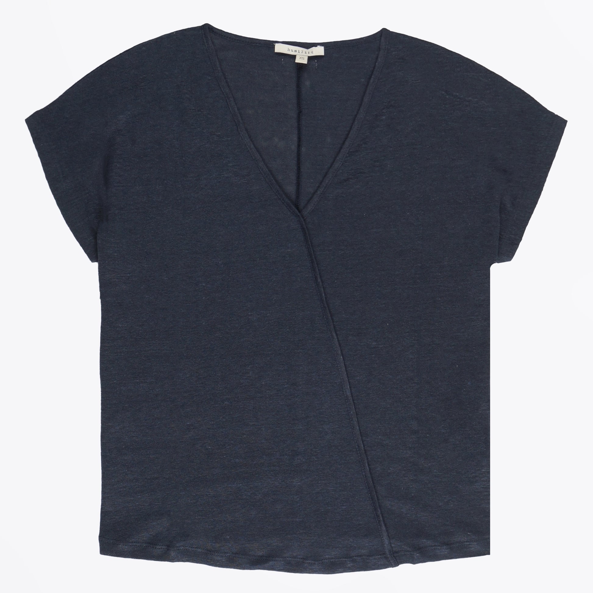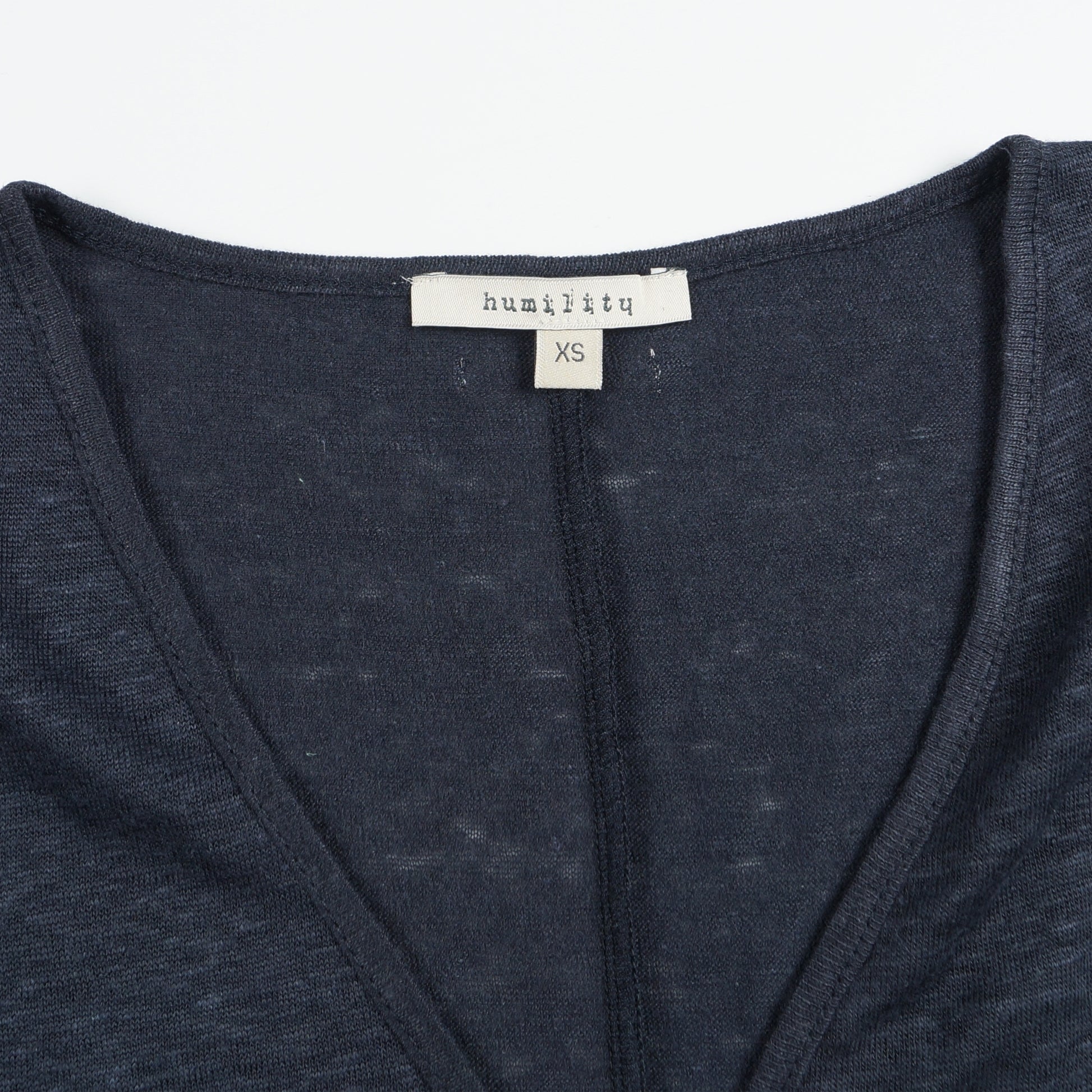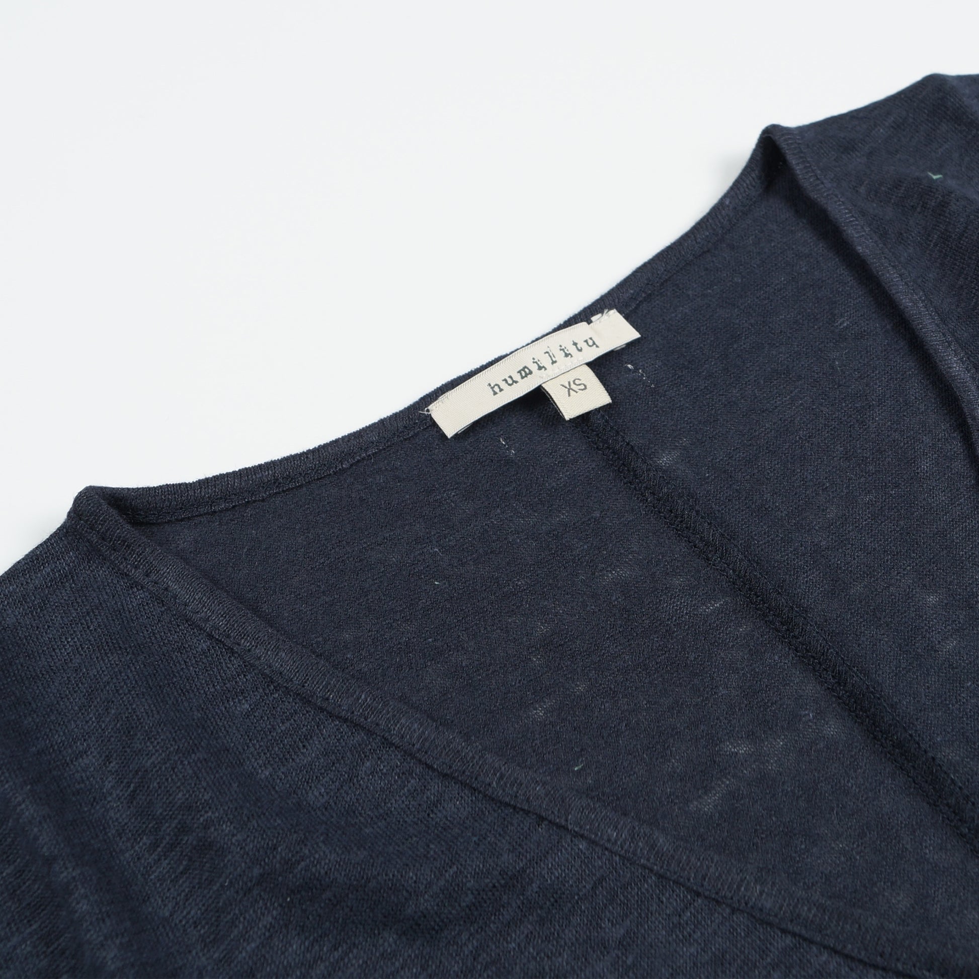 Humility conveys contemporary, comfort and practicality in her designs. The flexibility in mixing and matching fabrics and masterfully cut lines complement the female silhouette exquisitely. Update your summer essentials with this lightweight option from Humility. Crafted in a linen material, this navy t-shirt features a v-neckline, with a diagonal front seam, seamless short sleeves, and straight hems. Style this top with a pair of your favourite designer jeans and some Hoff trainers for a touch of colour.