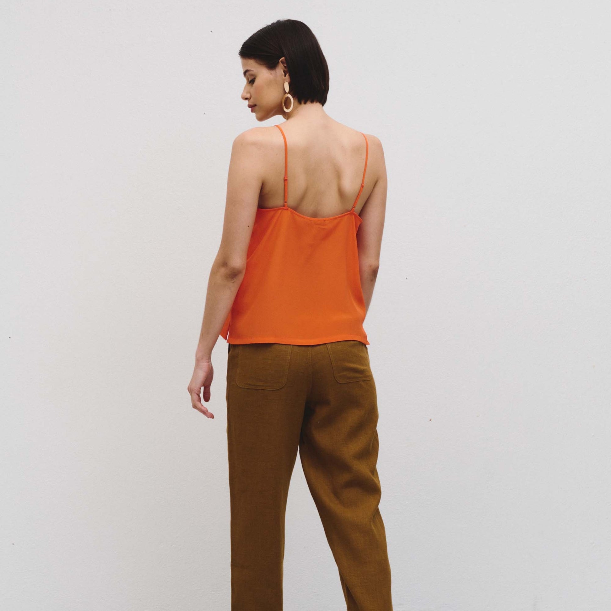 Born through the collaboration of a renowned fashion workshop and an enthusiastic designer, Idano is known for bringing Parisian ready-to-wear to the rest of the world. Idano pride themselves on their selectiveness with their materials and their ability to create on trend clothes, that ooze personality and uniqueness. Add beautiful colour to your new season wardrobe with this Idano option. Crafted in a floaty silk material, this orange top features a v-neckline, with adjustable spaghetti straps, and a lower backline. Style this top with a pair of designer jeans, and some Veja trainers for a great casual look.