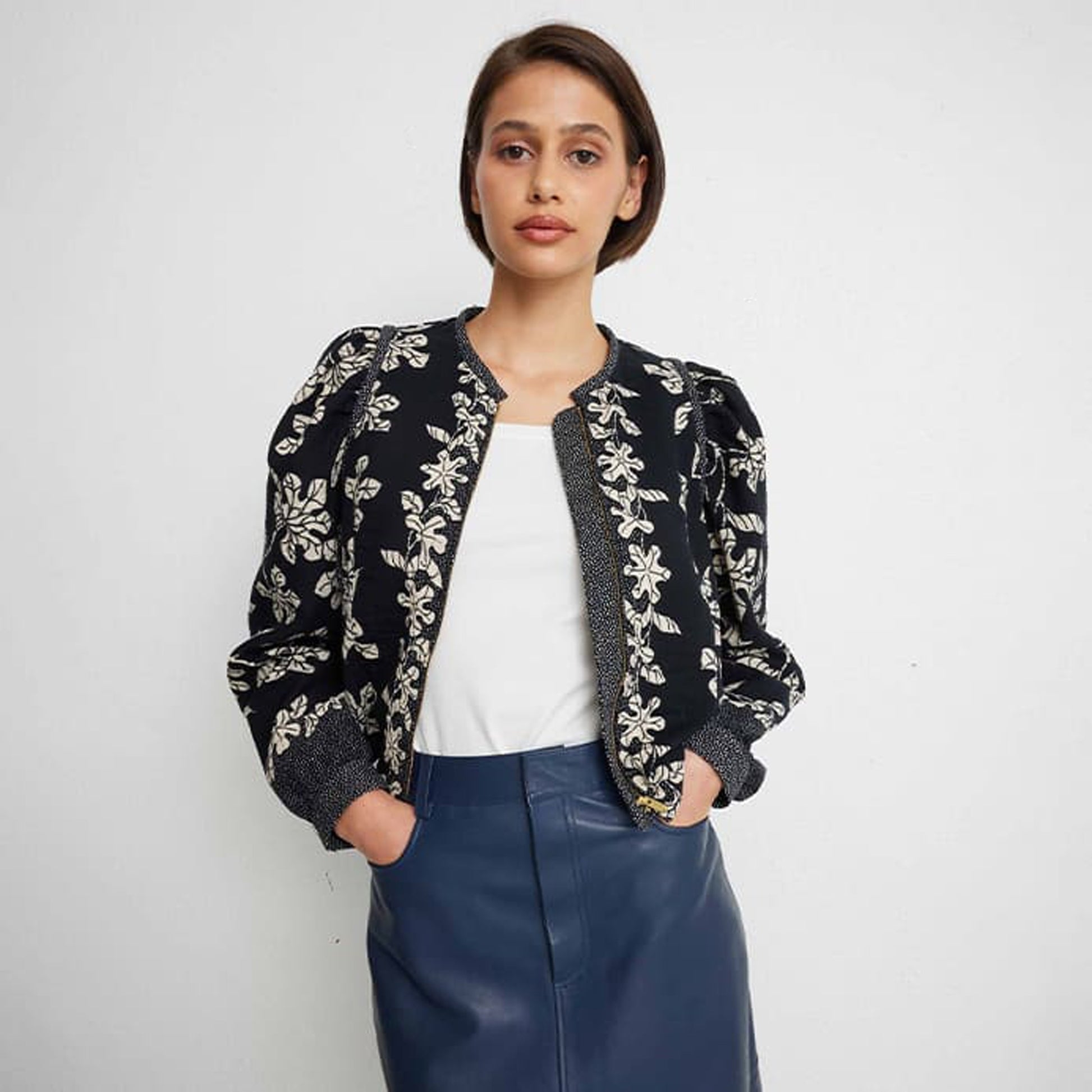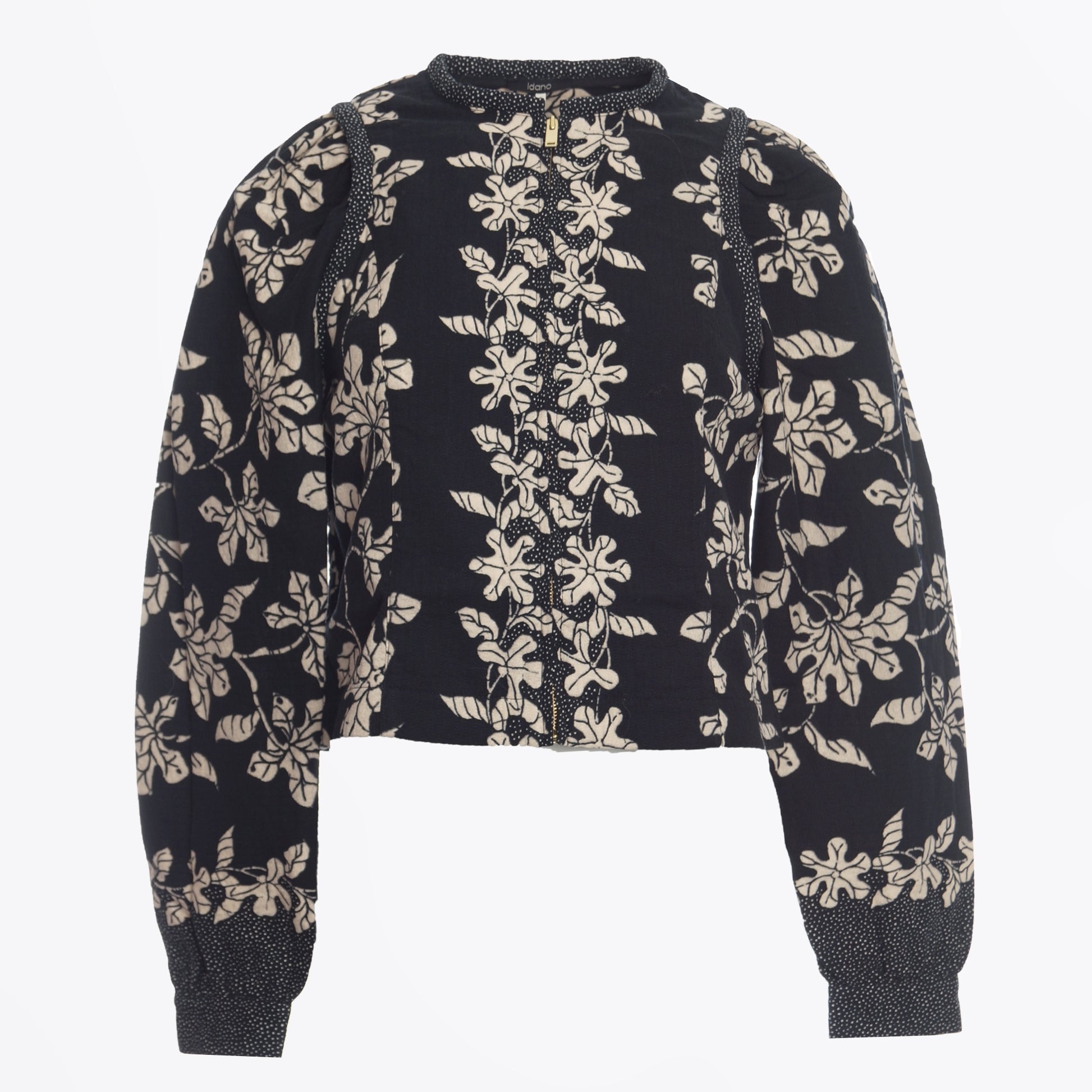 Born through the collaboration of a renowned fashion workshop and an enthusiastic designer, Idano is known for bringing Parisian ready-to-wear to the rest of the world. Idano pride themselves on their selectiveness with their materials and their ability to create on trend clothes, that ooze personality and uniqueness. Incorporate pattern and effortless style into your winter wardrobe with this option from Idano. This jacket features a botanical inspired print in off-white and black, with front zip fastening, gathered shoulders, spotted cuffs, and a piped neckline. Wear this jacket over an American Vintage top and with some designer denim.