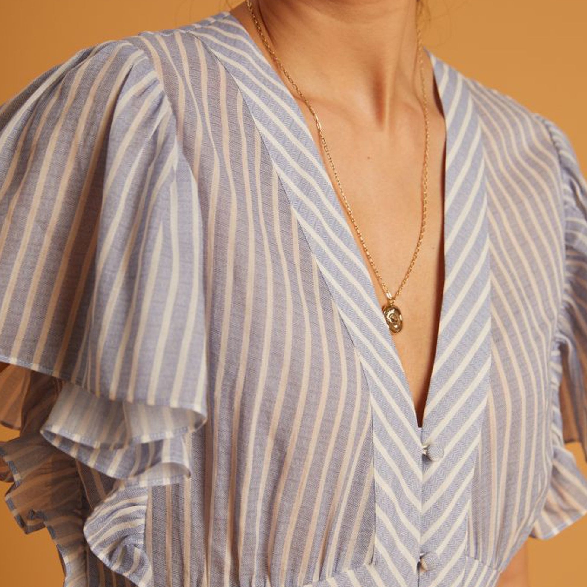 Born through the collaboration of a renowned fashion workshop and an enthusiastic designer, Idano is known for bringing Parisian ready-to-wear to the rest of the world. Idano pride themselves on their selectiveness with their materials and their ability to create on trend clothes, that ooze personality and uniqueness. This maxi dress is crafted from a floaty striped material, perfect for the warmer months. This dress has angel sleeves, a deep v-neckline, and a button-down design. Wear this dress with a pair of chunky designer trainers for a relaxed weekend outfit, or with some heels and statement jewellery for a more upscale outfit.