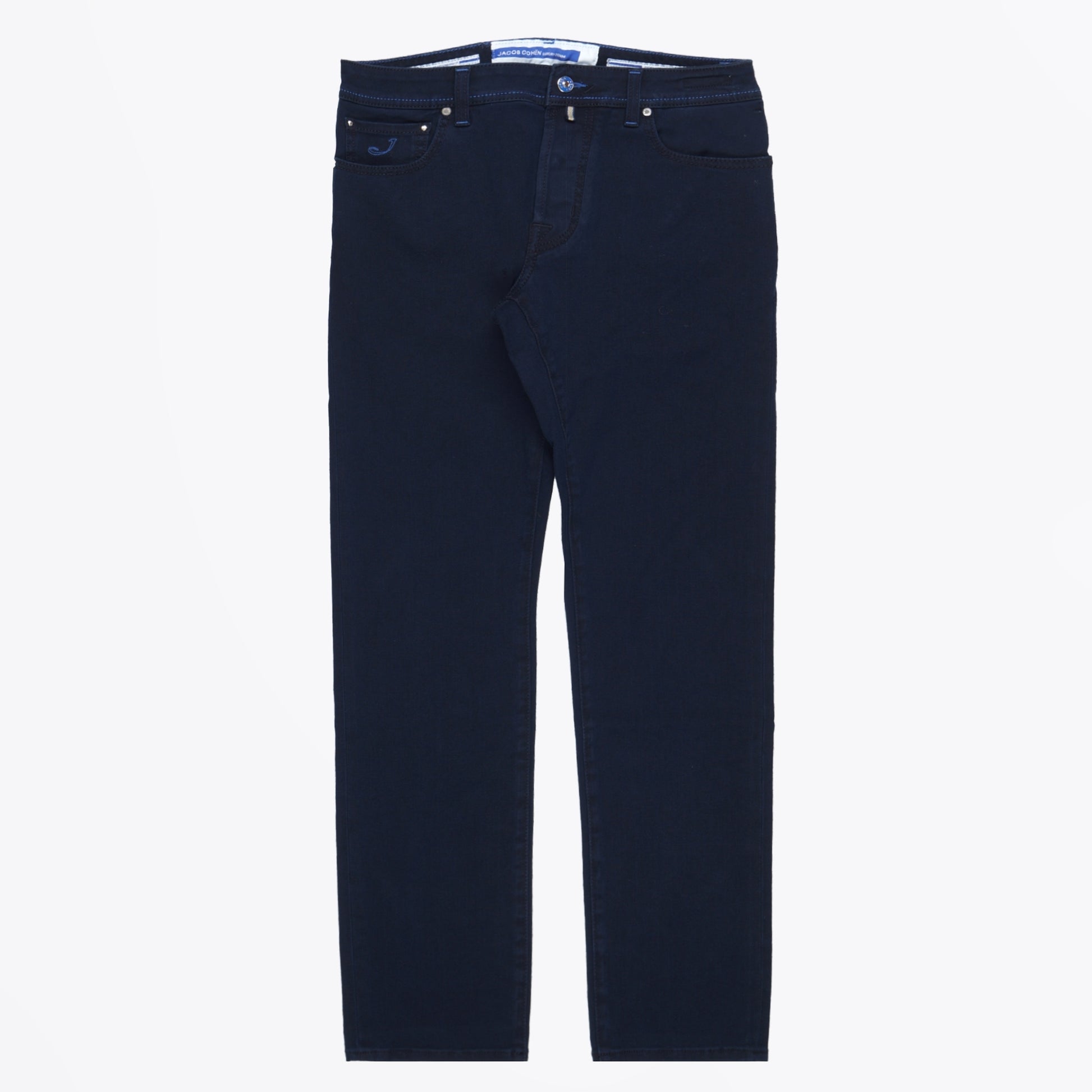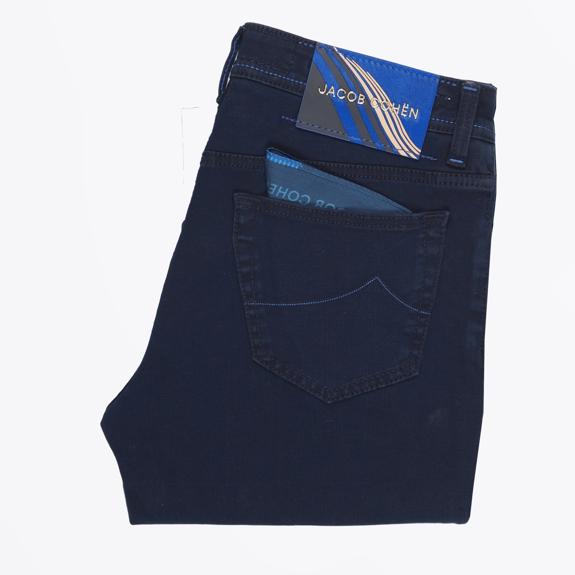 Jacob Cohen as a brand is a true symbol of denim jean couture.  Using the highest quality of denim, these jeans have a perfect fit, superb materials, and a glorious finish. This pair of premium-edition jeans are in a dark blue wash, and are crafted in a stretch denim material. These jeans feature the iconic Jacob Cohen pony hair patch with a wave design in their signature cobalt blue shade. The jeans also feature a 5-pocket style, with embroidered details on the coin pocket and the trouser fly. These jeans come with a branded Jacob Cohen pocket square in a teal blue shade and a spool of thread. Wear these jeans with a Paul Smith knitted jumper to create a casual outfit with a luxury twist.