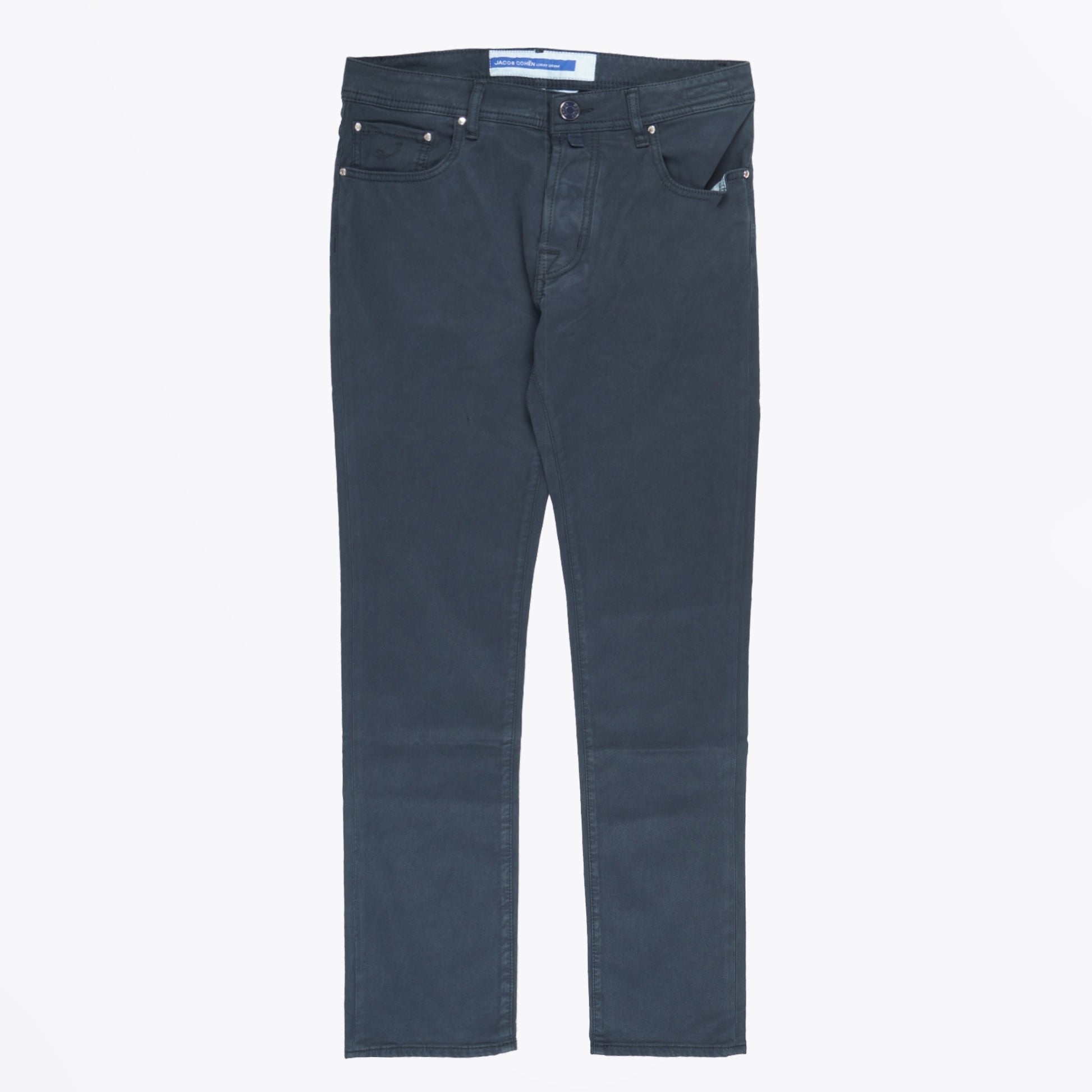Jacob Cohen as a brand is a true symbol of denim jean couture.  Using the highest quality of denim, these jeans have a perfect fit, superb materials, and a glorious finish. These dark blue jeans are crafted in a slim fit, with tan coloured top stitching, with dark silver coloured hardware, a navy button fastening, 5-pocket style, and an embroidered logo on the coin pocket. These jeans also have a navy handkerchief, and a navy pony hair leather patch on the back waistband. Wear these jeans with any of your weekend outfits and pair with some designer trainers.