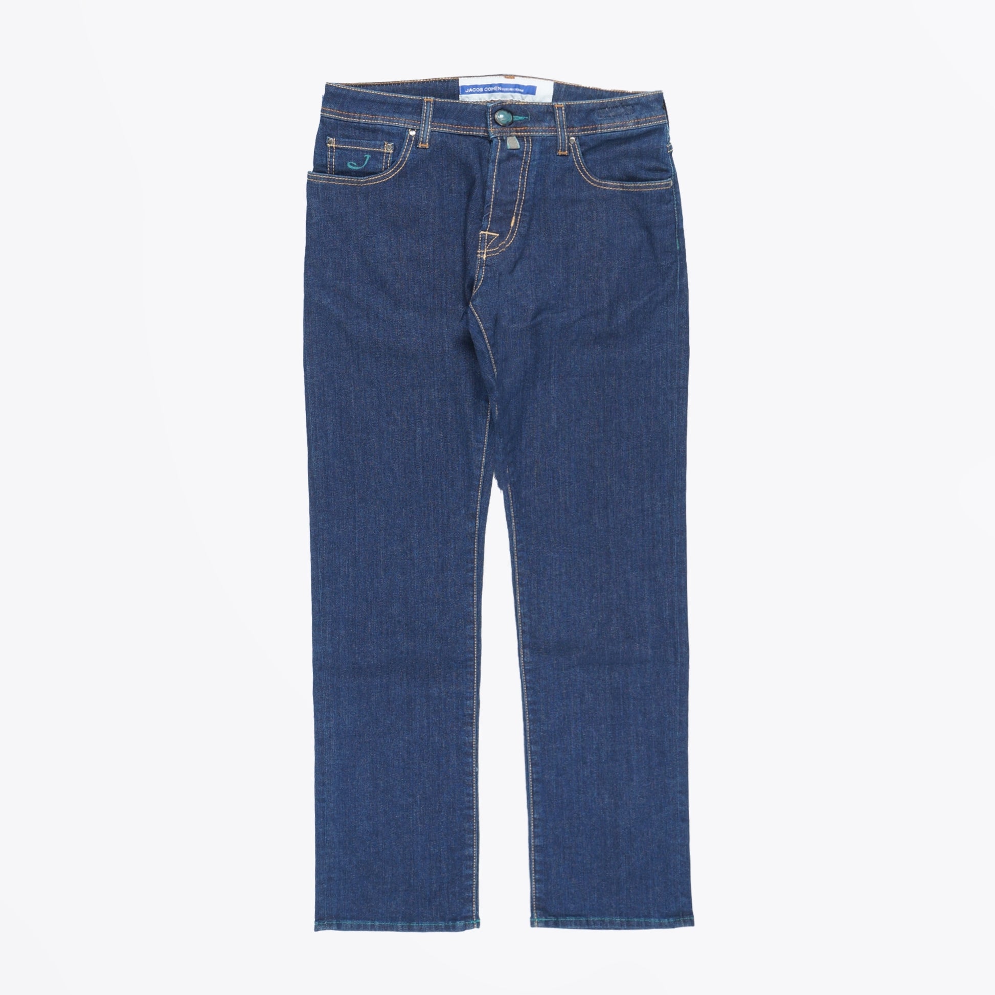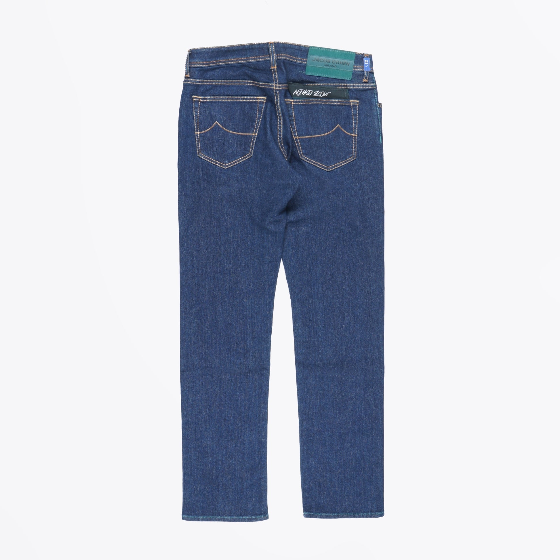 Jacob Cohen as a brand is a true symbol of denim jean couture.  Using the highest quality of denim, these jeans have a perfect fit, superb materials, and a glorious finish. These blue jeans are crafted in a slim fit, with blue coloured top stitching, with dark silver coloured hardware, a silver button and zip fly fastening, a 5-pocket style, and an embroidered logo on the coin pocket. These jeans also have an navy handkerchief, and a navy pony hair leather patch on the back waistband. Wear these jeans with any of your weekend outfits and pair with some designer trainers.