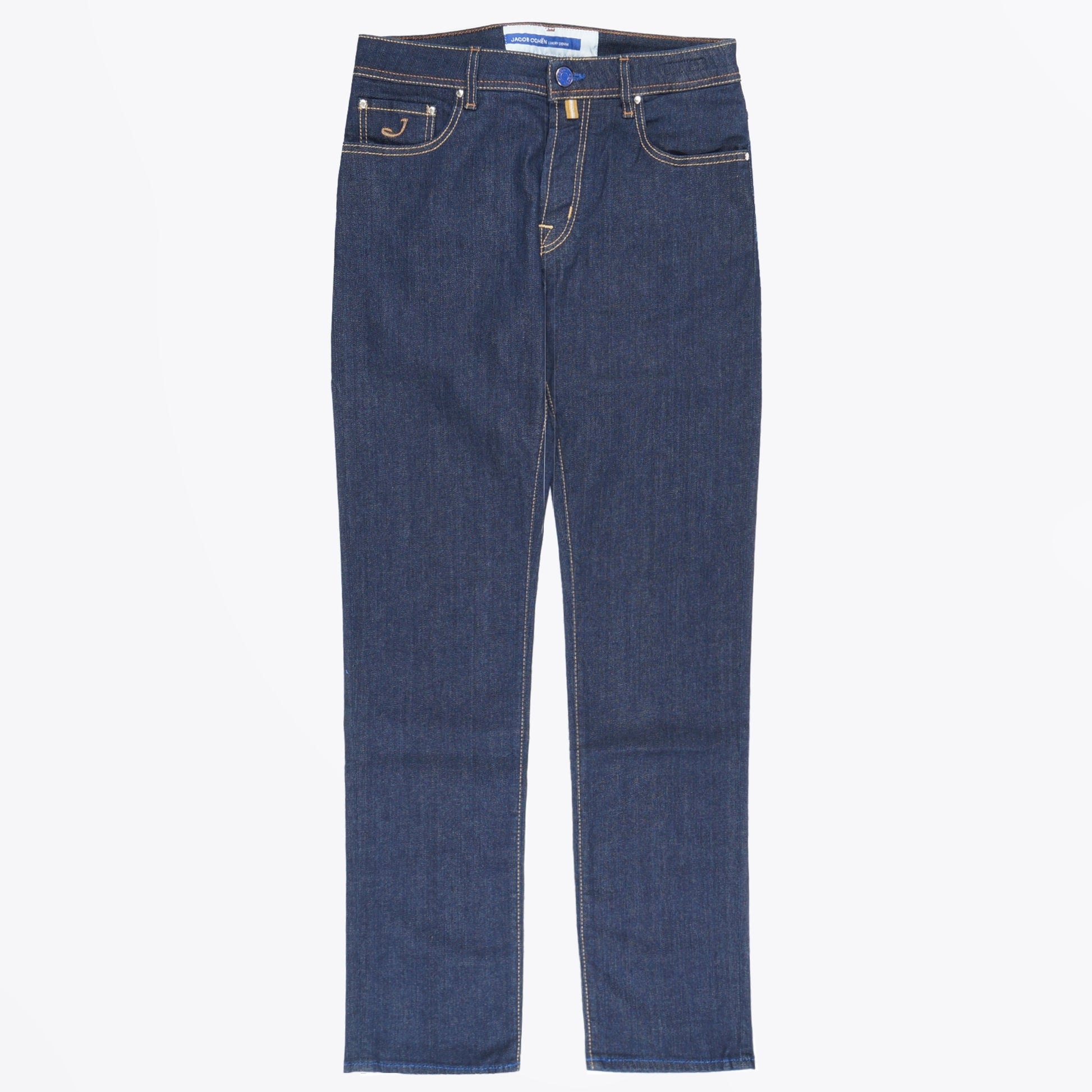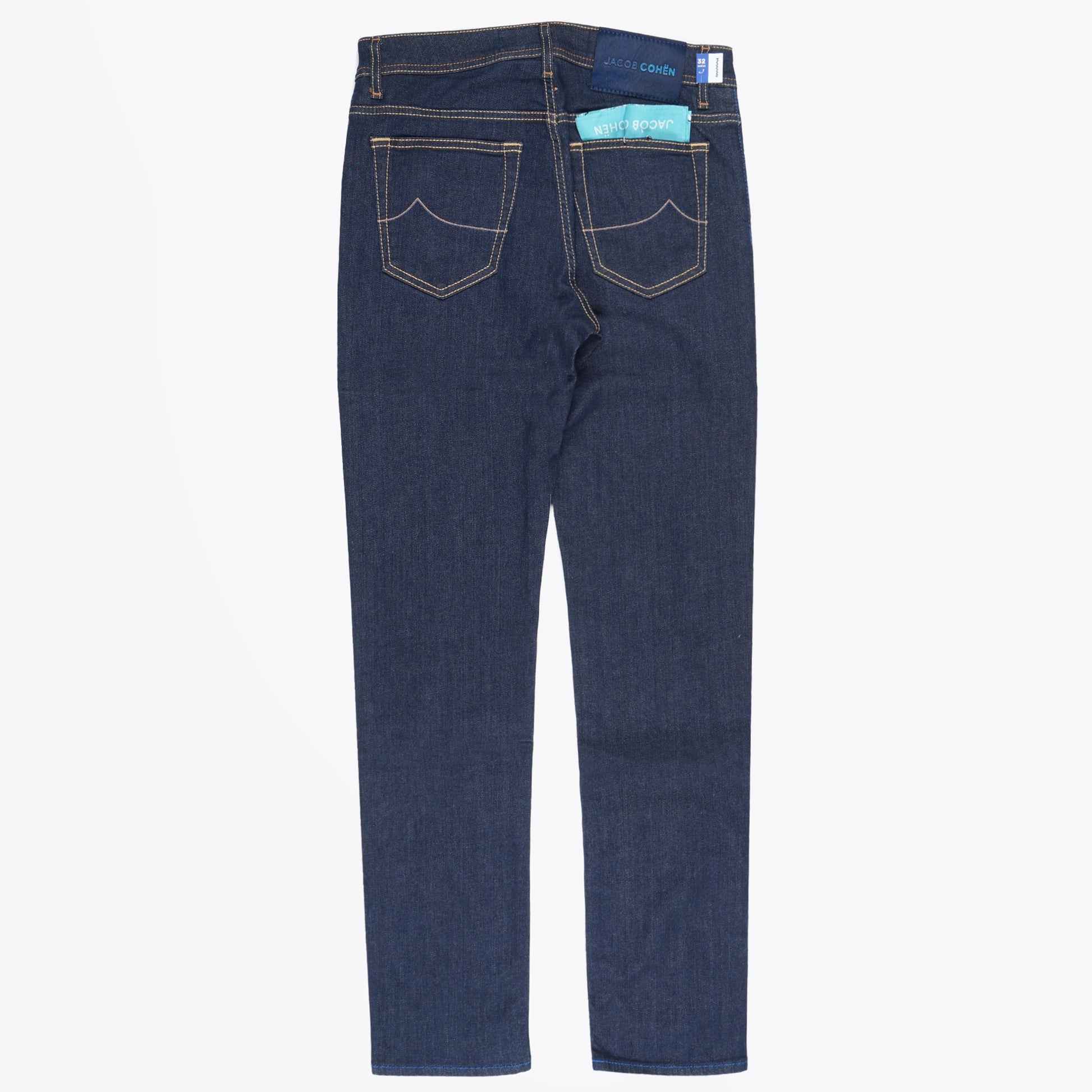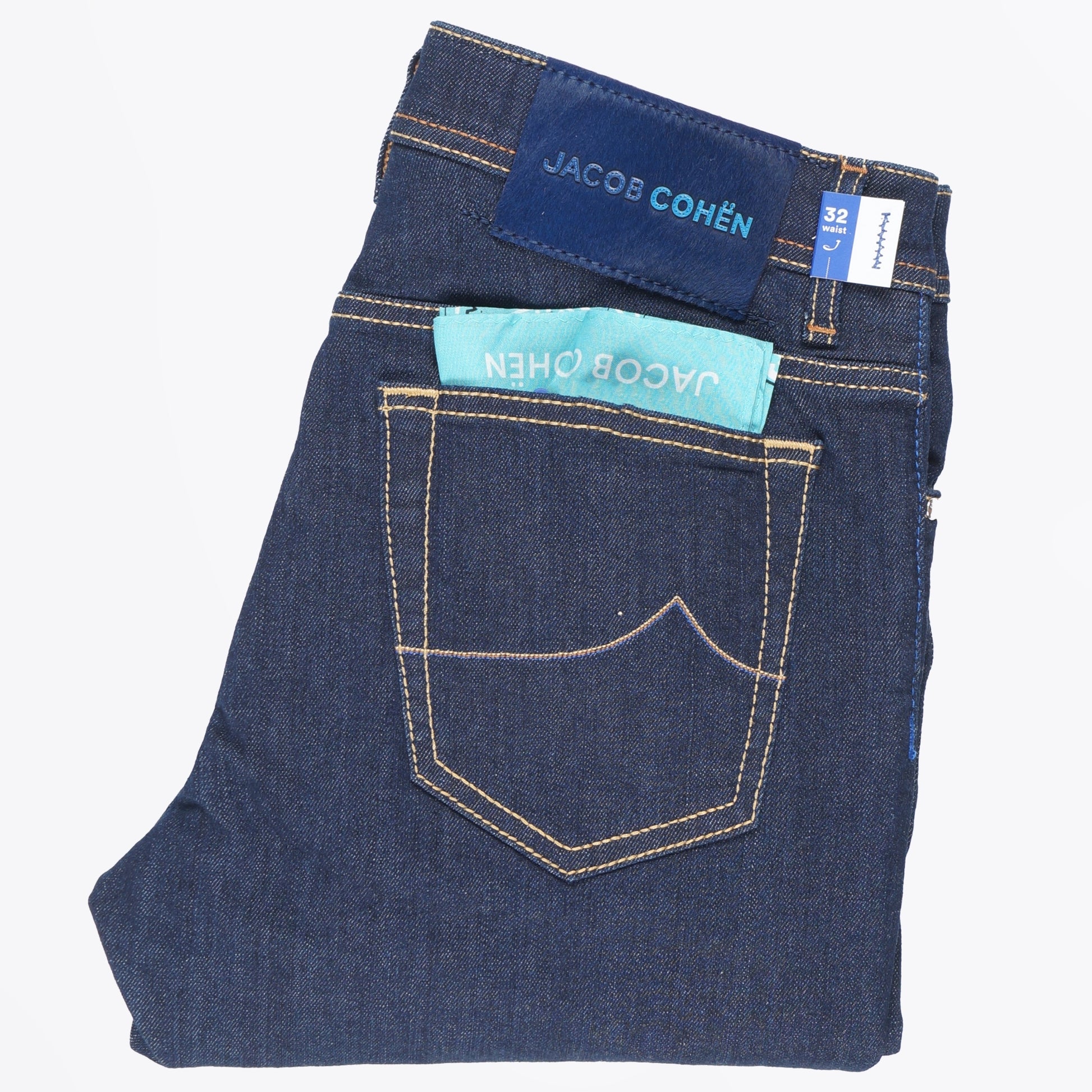 Jacob Cohen as a brand is a true symbol of denim jean couture.  Using the highest quality of denim, these jeans have a perfect fit, superb materials, and a glorious finish. These indigo jeans are crafted in a slim fit, with tan coloured top stitching, with dark silver coloured hardware, a blue button fastening, a 5-pocket style, and an embroidered logo on the coin pocket. These jeans also have a teal handkerchief, and a indigo pony hair leather patch on the back waistband. Wear these jeans with any of your weekend outfits and pair with some designer trainers.