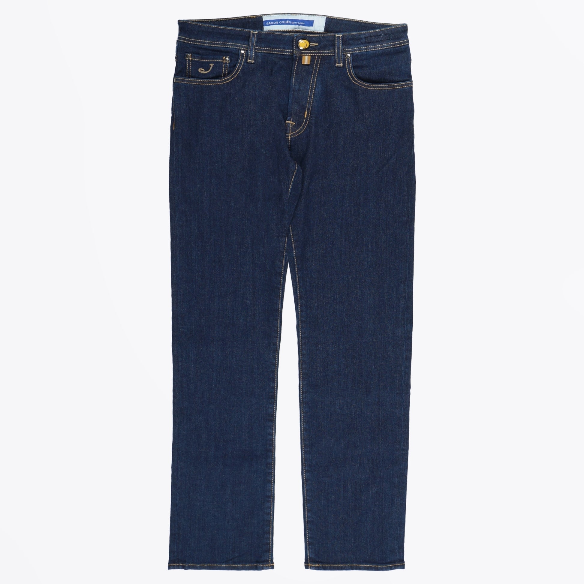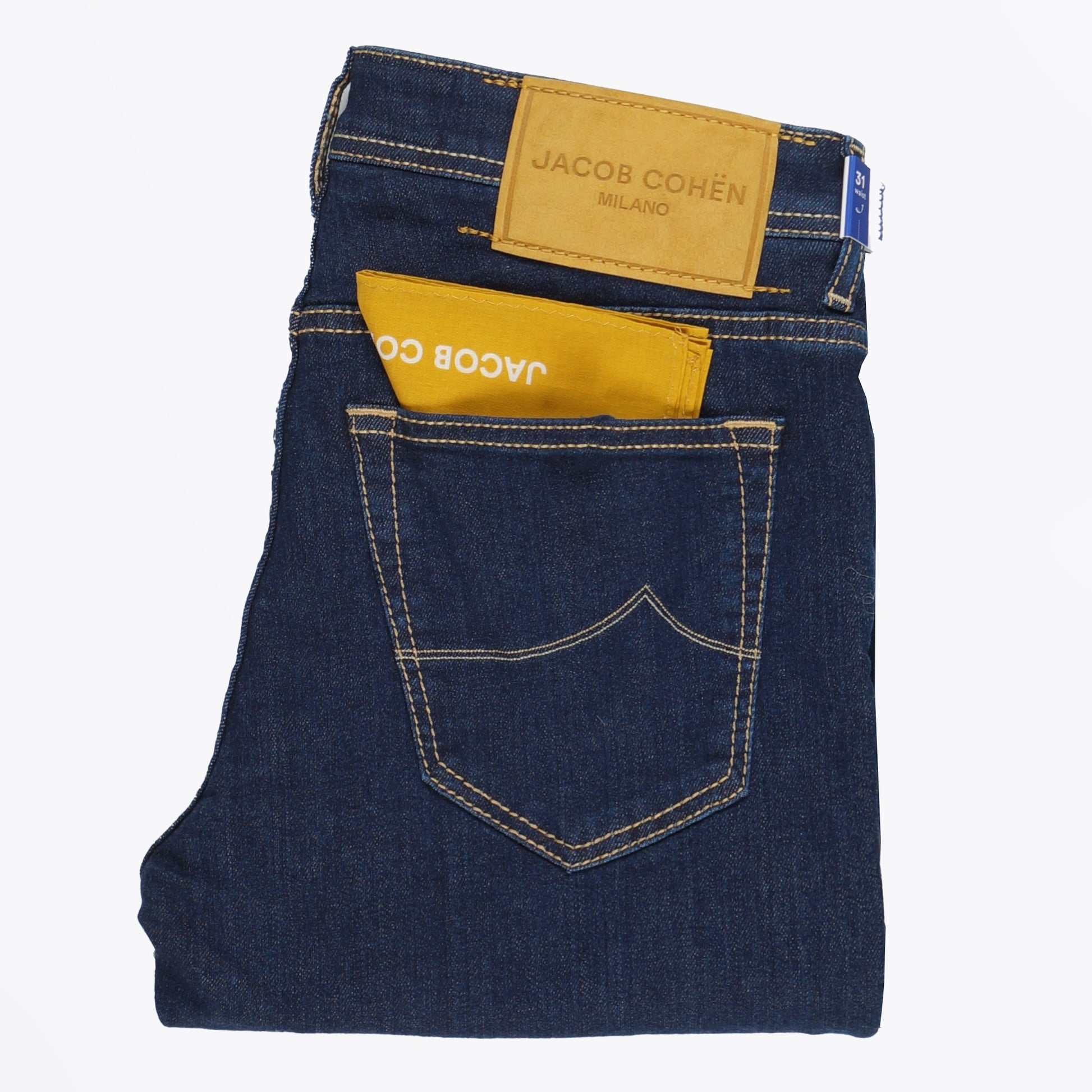 Jacob Cohen as a brand is a true symbol of denim jean couture.  Using the highest quality of denim, these jeans have a perfect fit, superb materials, and a glorious finish. These deep blue jeans are crafted in a slim fit, with tobacco and beige coloured top stitching, with silver coloured hardware, button fly fastening, a 5-pocket style, and an embroidered logo on the coin pocket. These jeans also have a mustard handkerchief, and a mustard suede leather patch on the back waistband. Wear these jeans with any of your weekend outfits and pair with some designer trainers.