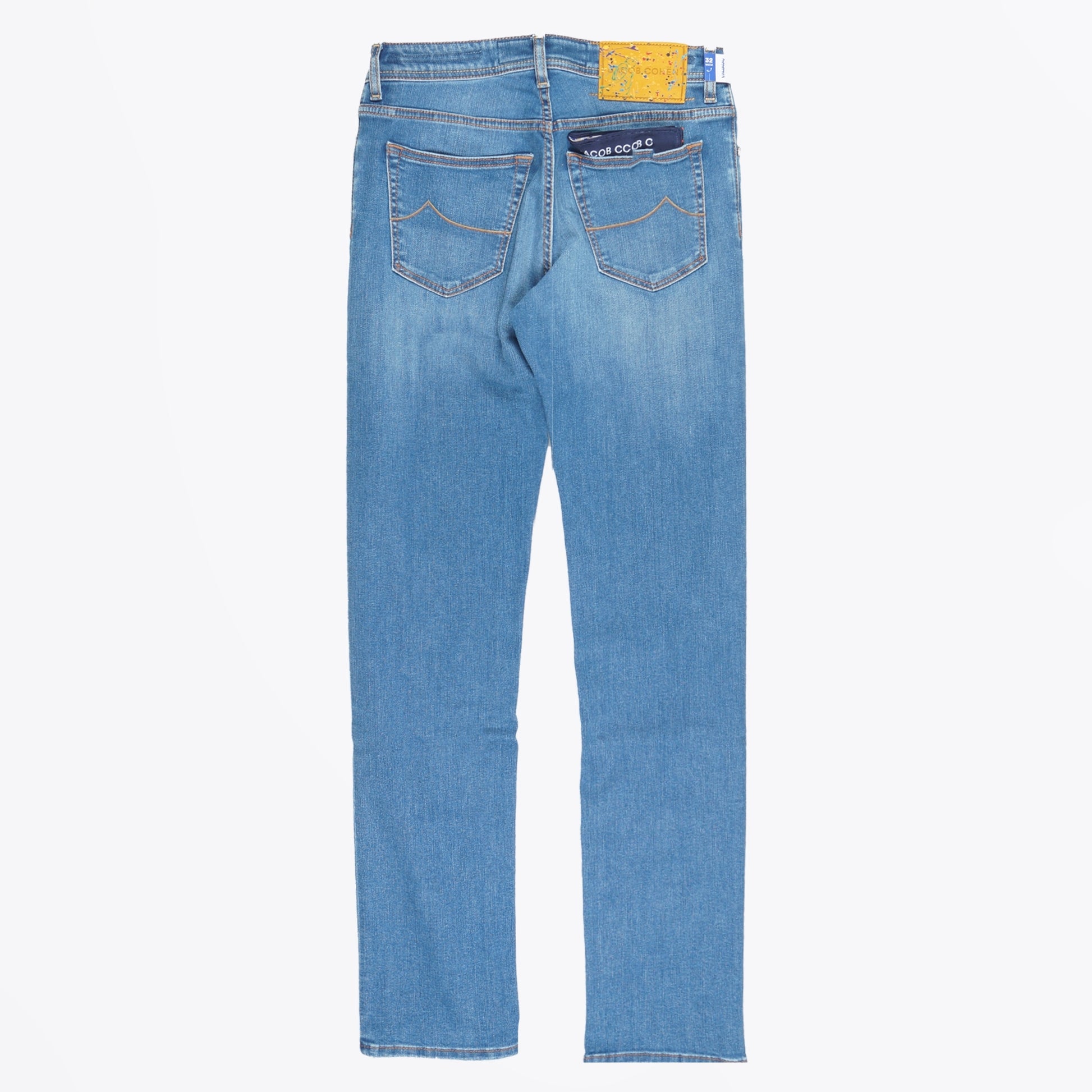 Jacob Cohen as a brand is a true symbol of denim jean couture.  Using the highest quality of denim, these jeans have a perfect fit, superb materials, and a glorious finish. These dark blue jeans are crafted in a slim fit, with tan coloured top stitching, with dark silver coloured hardware, a gold-plated button fastening, 5-pocket style, and an embroidered logo on the coin pocket. These jeans also have a multi coloured handkerchief, and a mustard plaint splat leather patch on the back waistband. Wear these jeans with any of your weekend outfits and pair with some designer trainers.