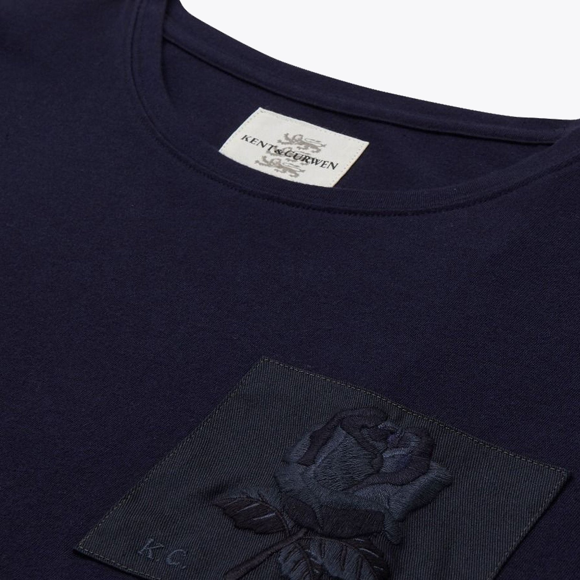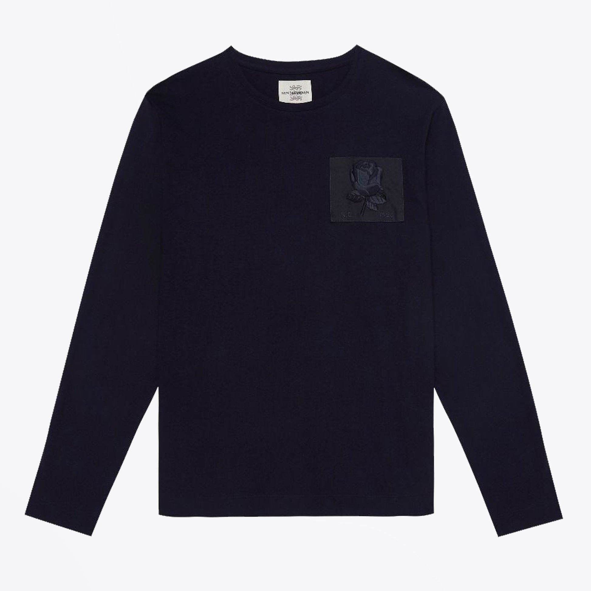 Introducing our newest Heritage label, Kent & Curwen to Mr & Mrs Stitch. Creative director Daniel Kearns along with David Beckham have launched the label to new heights. The brand incorporates their English heritage roots whilst offering effortless and sporting aesthetics to suit all stages of life. This iconic rose patch long-sleeve t-shirt in navy is a modern wardrobe staple all year round. Cut in fine soft cotton with classic fit and long sleeves this top with rose chest patch alludes to Kent & Curwen’s sporting heritage. Plain back. Treat yourself with this refined basic and layer under a Kent & Curwen sweater.