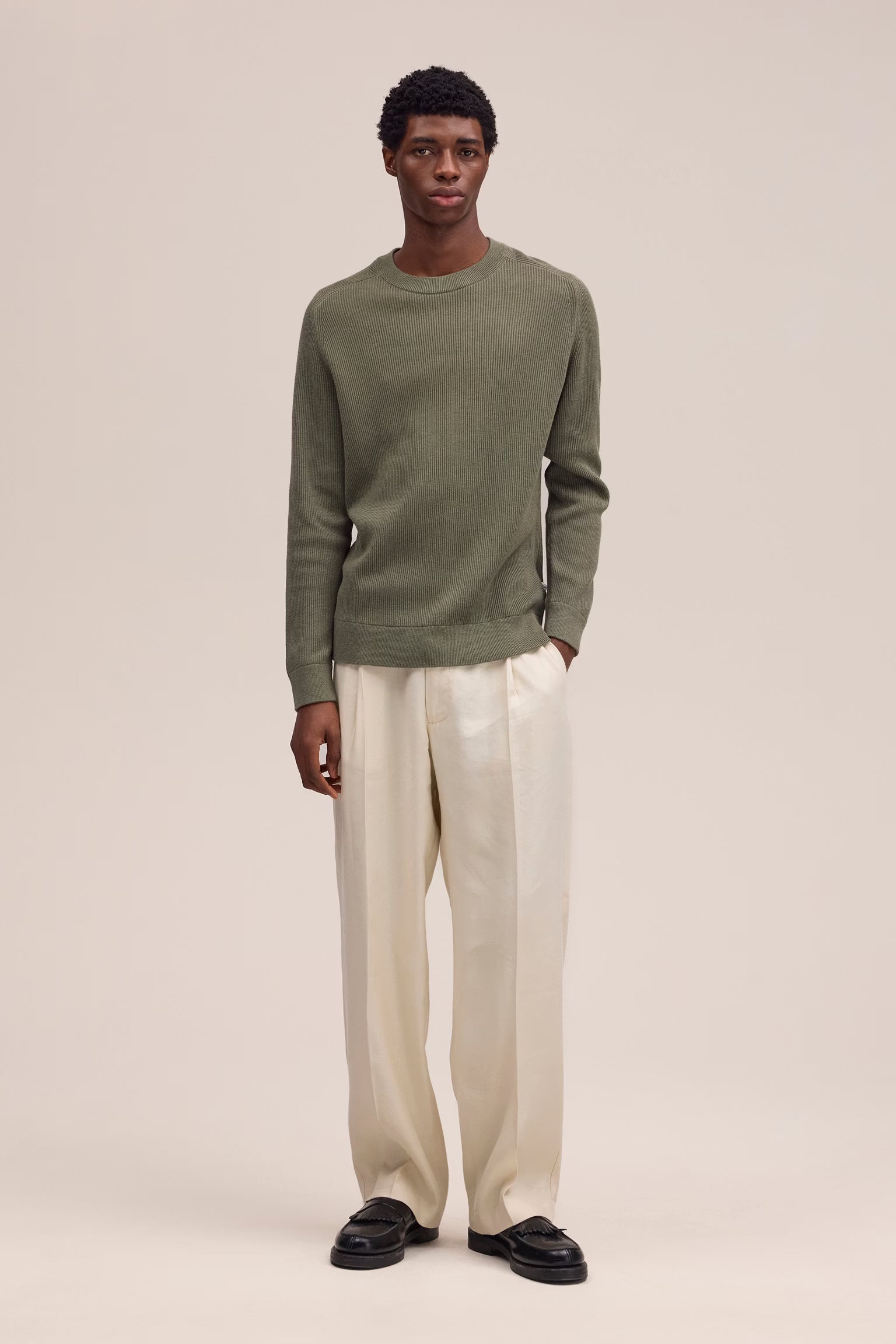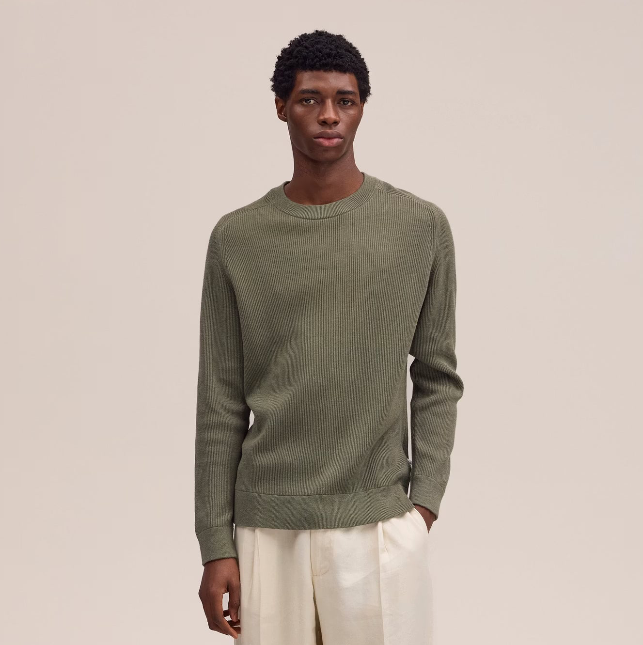 Elevate your everyday wardrobe with the Kevin Ribbed Organic Cotton Sweater in Capers. This versatile crew neck piece combines sustainable organic cotton with a refined ribbed knit, creating texture and visual interest. The signature saddle sleeves add a contemporary touch, while the lightweight construction makes it ideal for layering through transitional seasons or standing alone as a polished casual essential. Soft, breathable, and effortlessly stylish.
