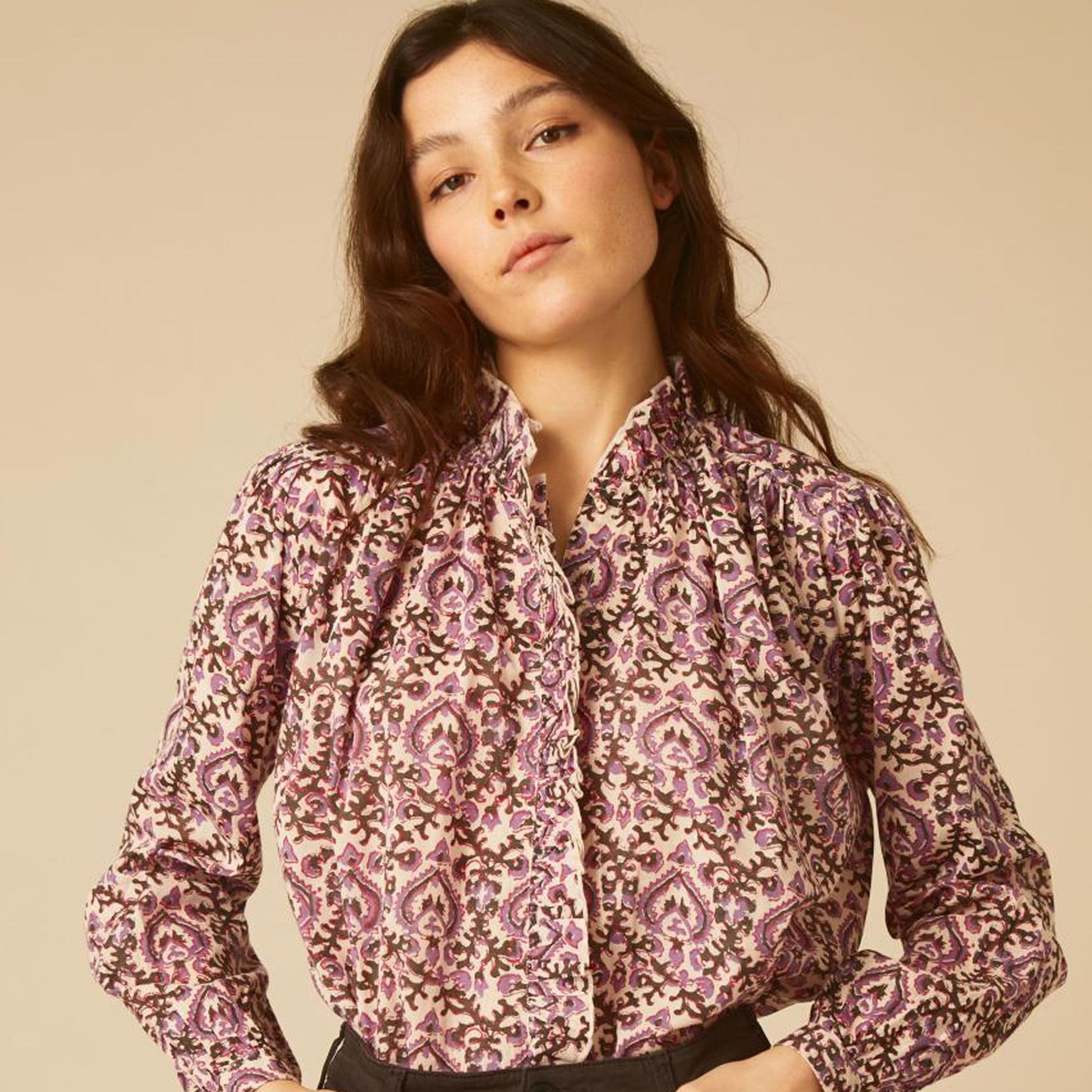 Introducing one of our newest women's labels, Leon & Harper to Mr & Mrs Stitch. Created in Paris in 2010 by Philippe Corbin, Leon & Harper has rapidly insinuated itself into the wardrobes of free-spirited young women through its timeless basics with their unique sense of detail. Leon & Harper creates fashion that is stylish and loose, designed for free movement and subtle seduction. This Delhi print blouse is crafted in 100% organic cotton and comes in the perfect spring print for the season. With its stand up collar details, it gives a more feminine touch to the traditional shirt. This blouse has been designed with a long sleeves, stand up collar, slightly oversized fit and lilac/purple Delhi print pattern.
