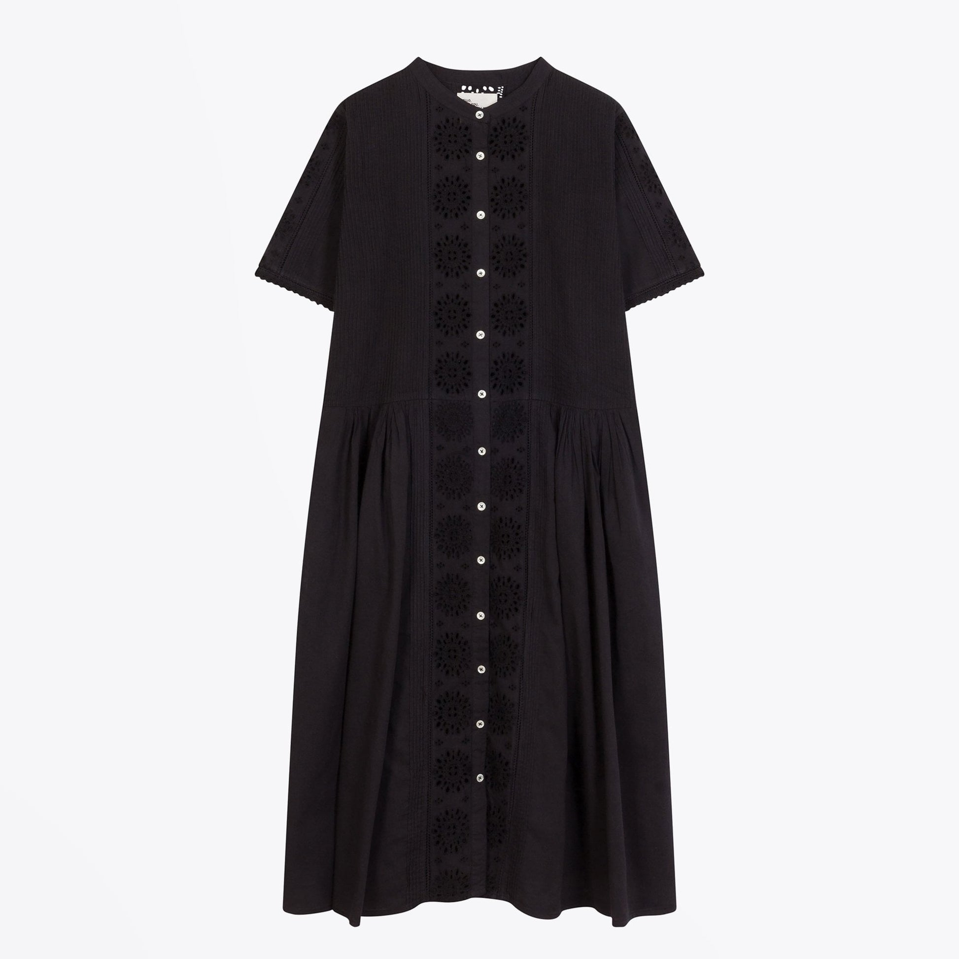 Introducing one of our newest women's labels, Leon & Harper to Mr & Mrs Stitch. Created in Paris in 2010 by Philippe Corbin, Leon & Harper has rapidly insinuated itself into the wardrobes of free-spirited young women through its timeless basics with their unique sense of detail. Leon & Harper creates fashion that is stylish and loose, designed for free movement and subtle seduction. This midi-length romantic-style dress with broderie anglais details is crafted in an organic cotton. This dress is ideal for Spring and has been designed with a short sleeves, button-down front and shirt collar. The dress is also lined. A beautiful piece that can be worn with a t-shirt underneath or a sleeveless denim jacket on top to give it more of a rock feel.